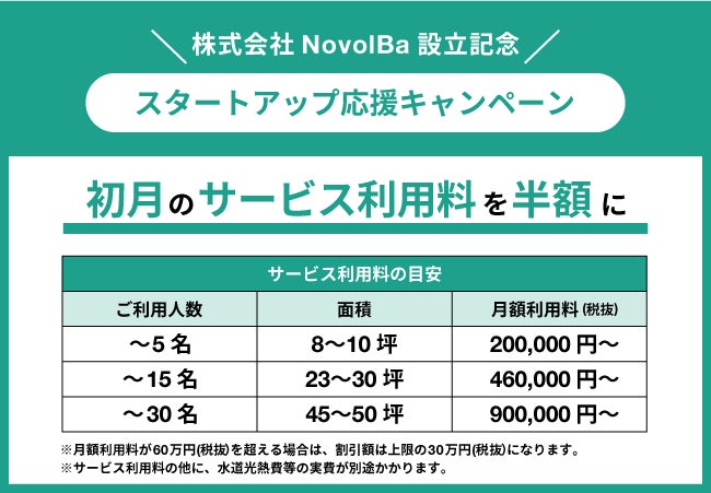 設立を記念して、挑戦するスタートアップを対象に、サービス利用料が初月分半額となるキャンペーンを実施いたします。