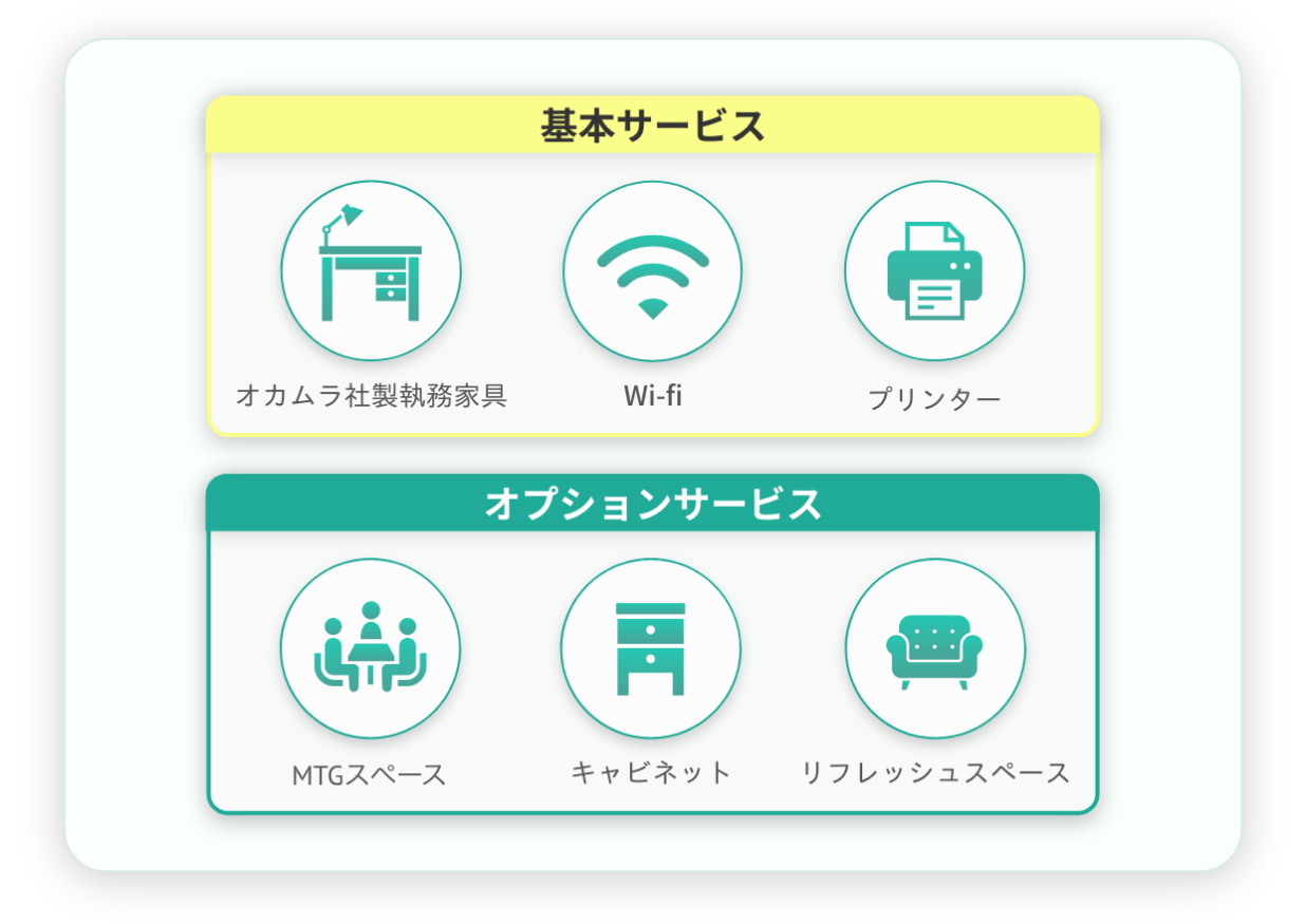 利用企業の要望をヒアリングし、通常の賃貸オフィスを「家具付き占有オフィス」として用意します。面倒な契約や手続きがなく、身軽に移転が可能です。
