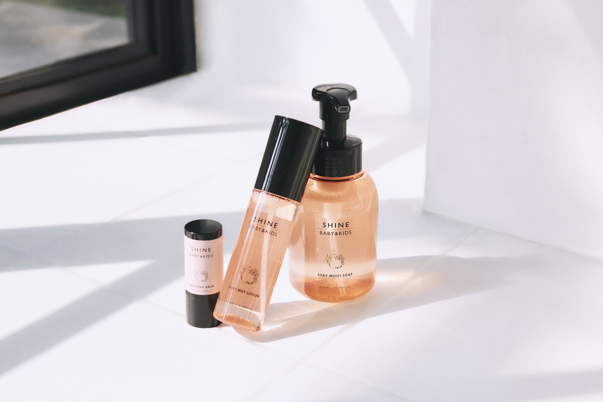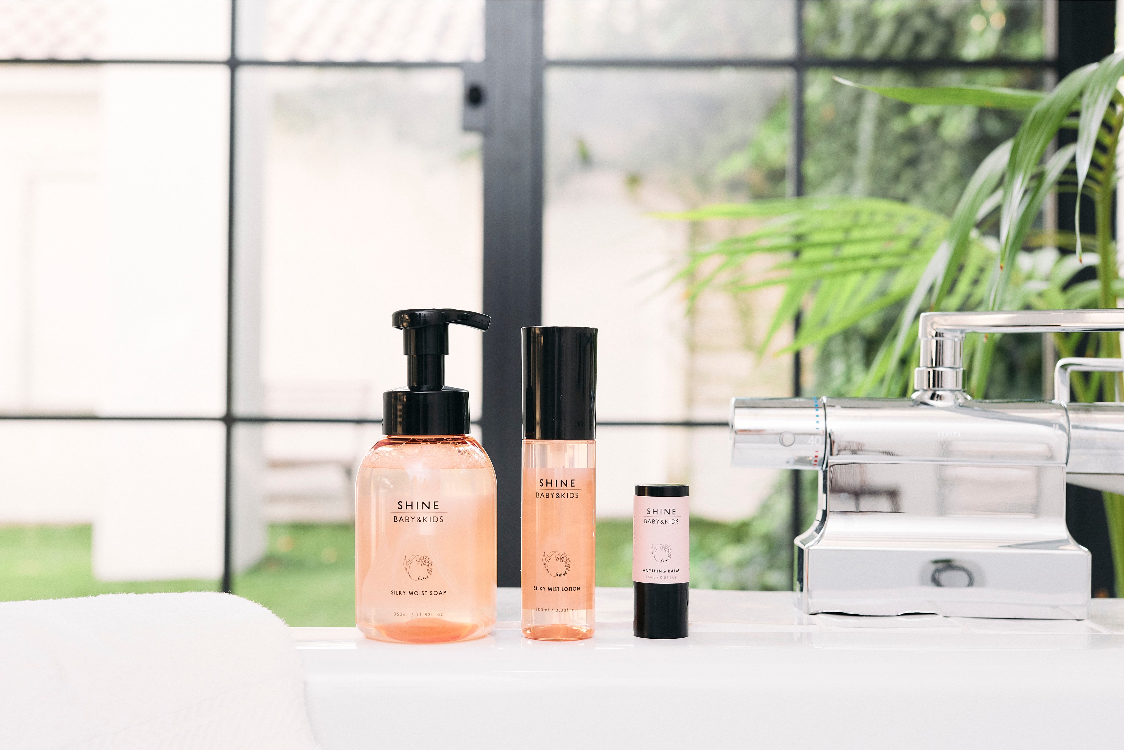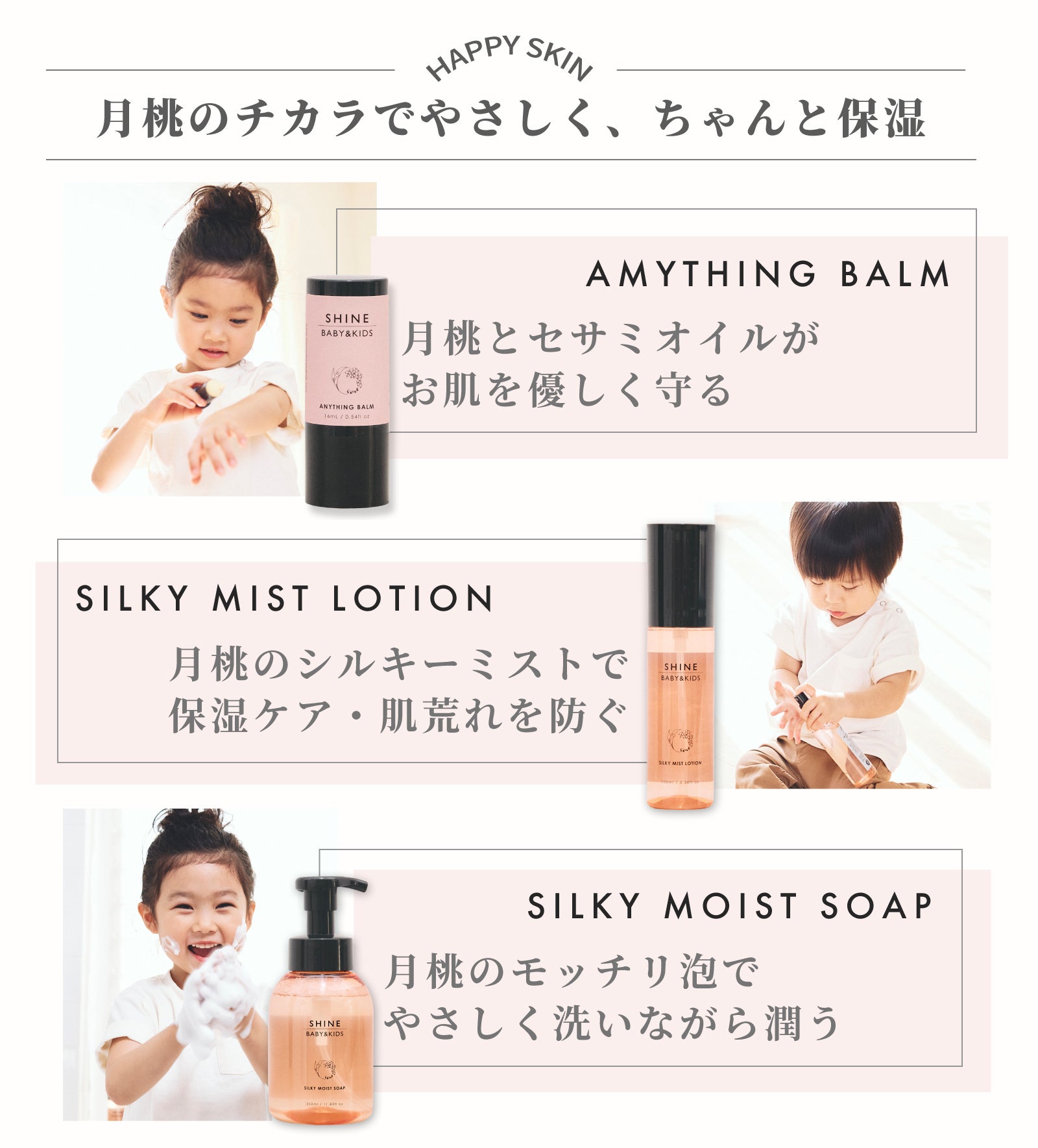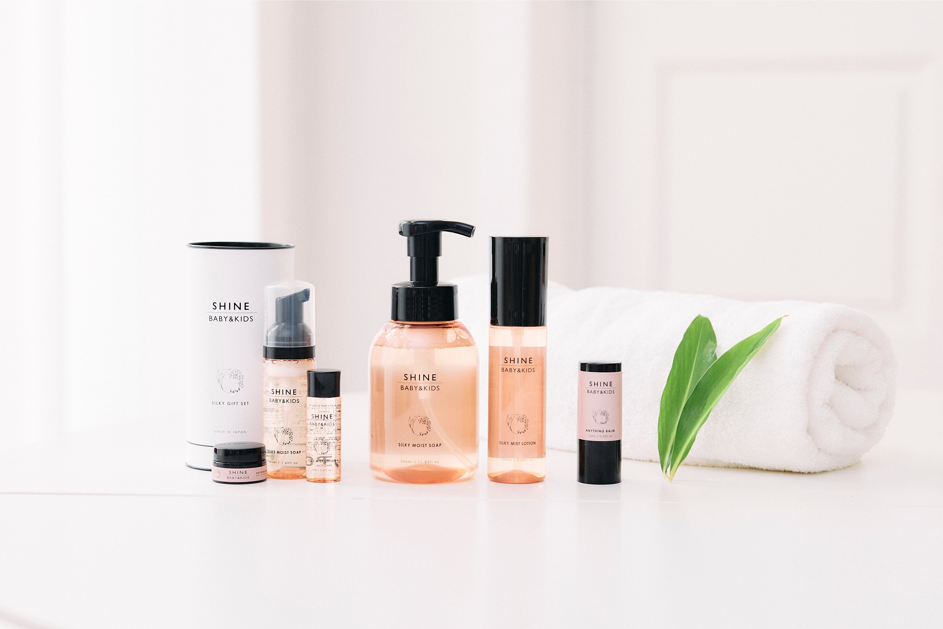 今回発売する[SHINE BABY&KIDS]のスキンケアシリーズは、エニシングバーム、シルキーミストローション、シルキーモイストソープ、シルキーギフトセットの全4種類。