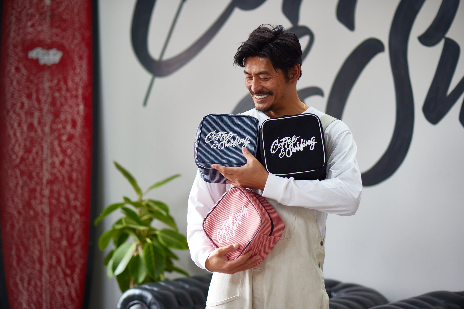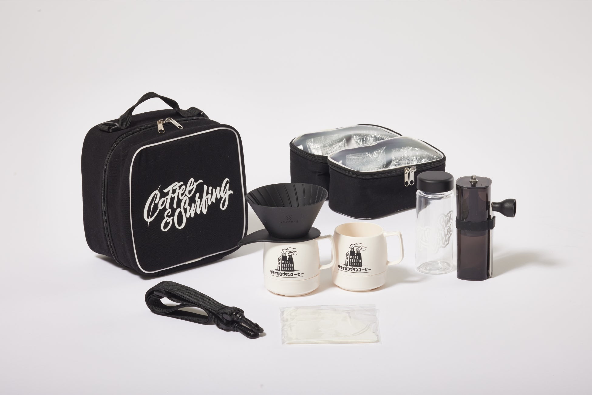 コーヒーの抽出に必要なグッズをオリジナルのバッグにひとまとめ。