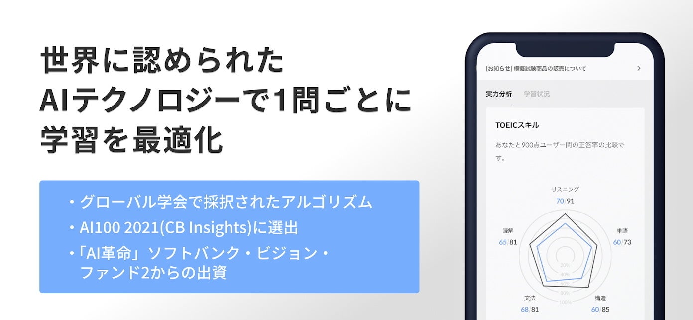 アジアを中心に世界で400万人*¹が利用し、3億問以上の解答データを解析した独自のAIが、問題を解くたびに学習者のTOEIC®︎スコアや理解度、弱点を正確に分析し、学習者に合わせて最適なカリキュラムを構築します。