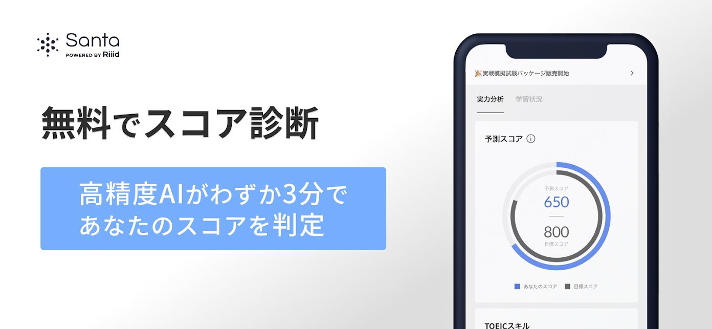 ソフトバンク・ビジョン・ファンド2から出資を受けるRiiid Inc.(本社:韓国ソウル市、CEO:チャン・ヨンジュン、以下「Riiid」)は12月24日、ディープラーニング予測モデルでのパーソナライズ学習を行うTOEIC®︎学習アプリ「Santa」をリリースいたしました。グローバルでのブランド名を「Santa」に統一し、日本市場への本格展開を開始いたします。