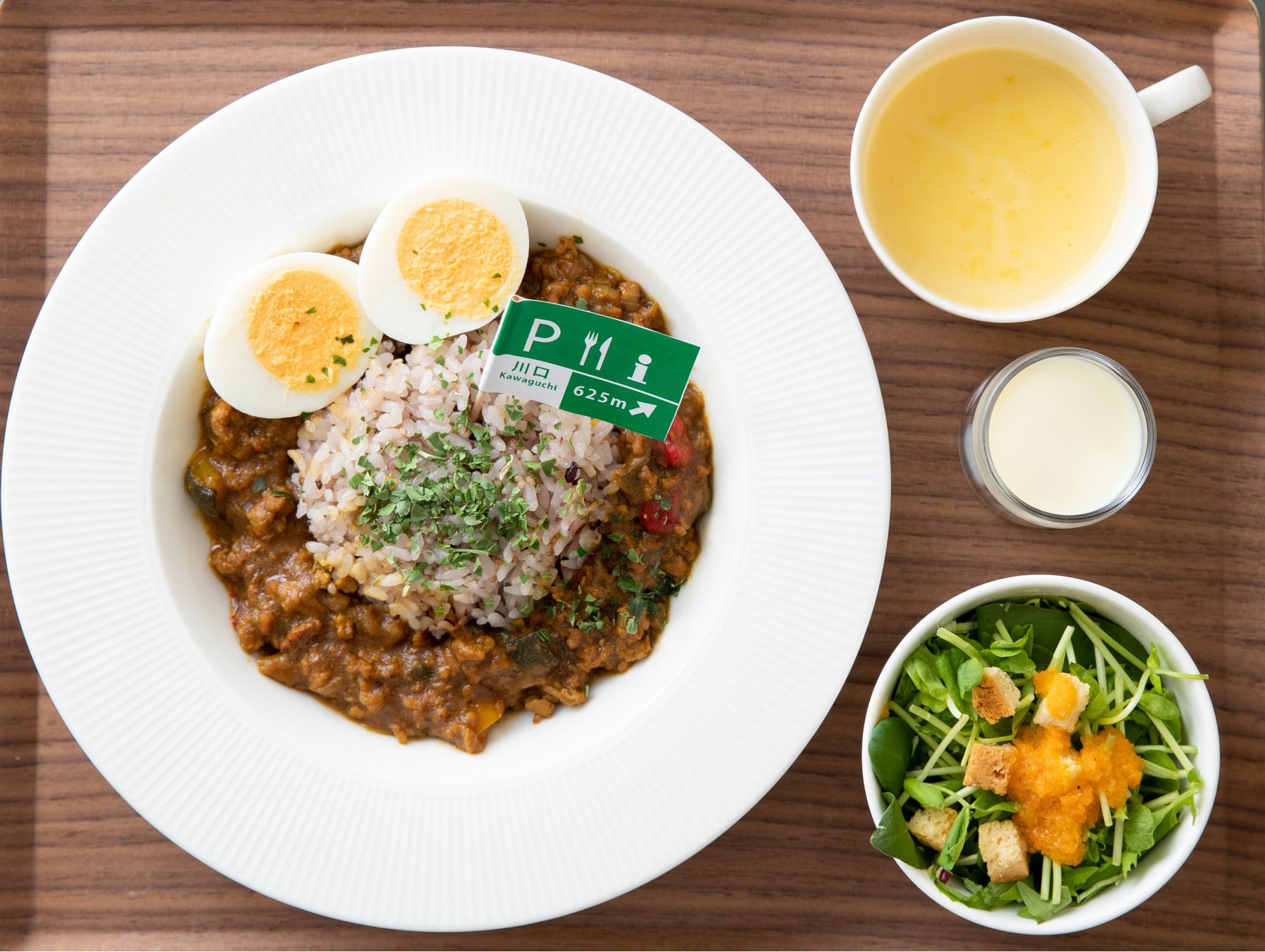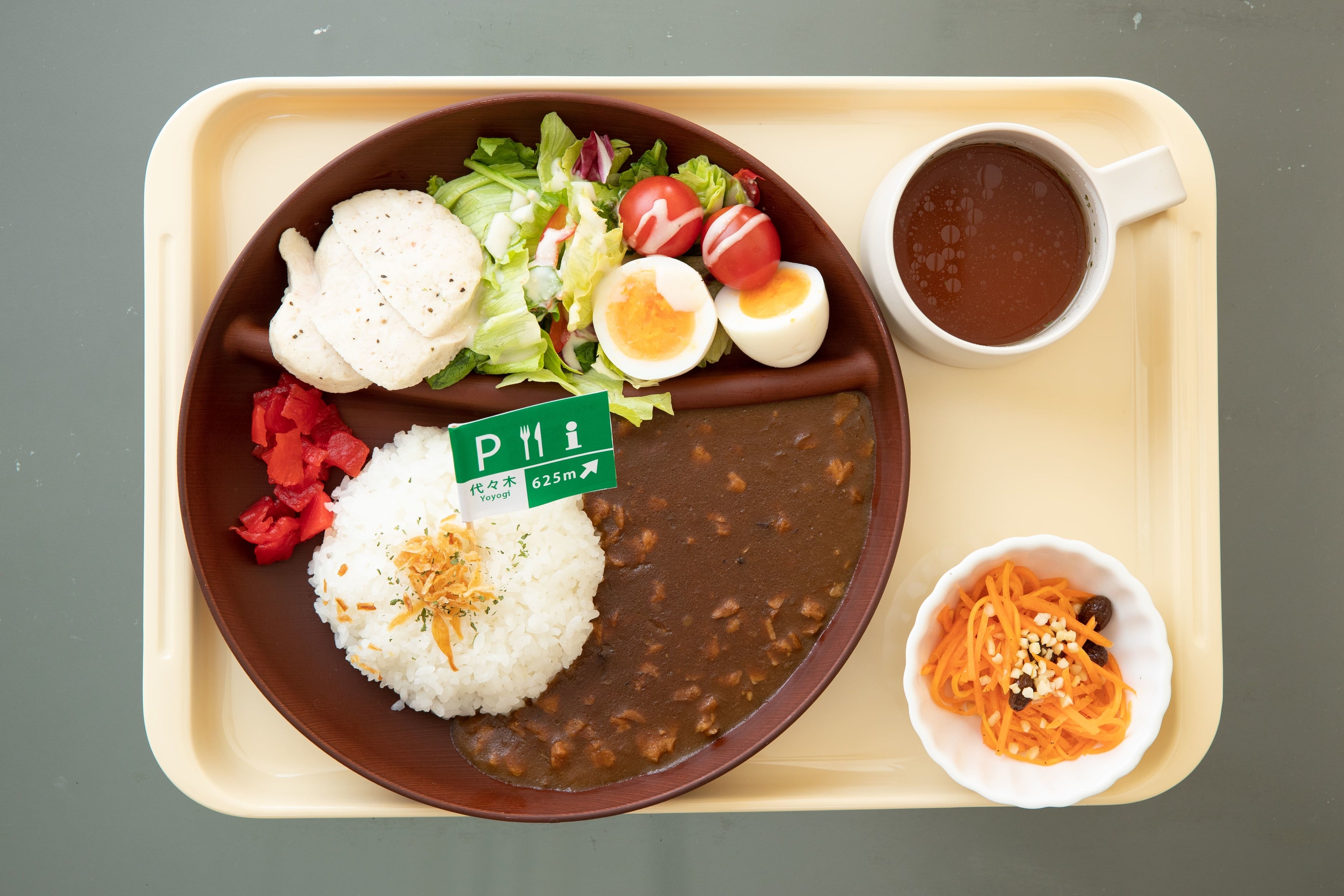 代々木PAで人気のカレーに話題の大豆ミートを加えました。レーズンとアーモンドを加えたフランスの家庭料理、キャロットラペや糖質ゼロのチキンサラダに卵、オニオンスープが付き、ヘルシーながら食べ応えも十分です。また、+150円でデザートのきなこ黒糖ソフトがついたセットに変更できます。
