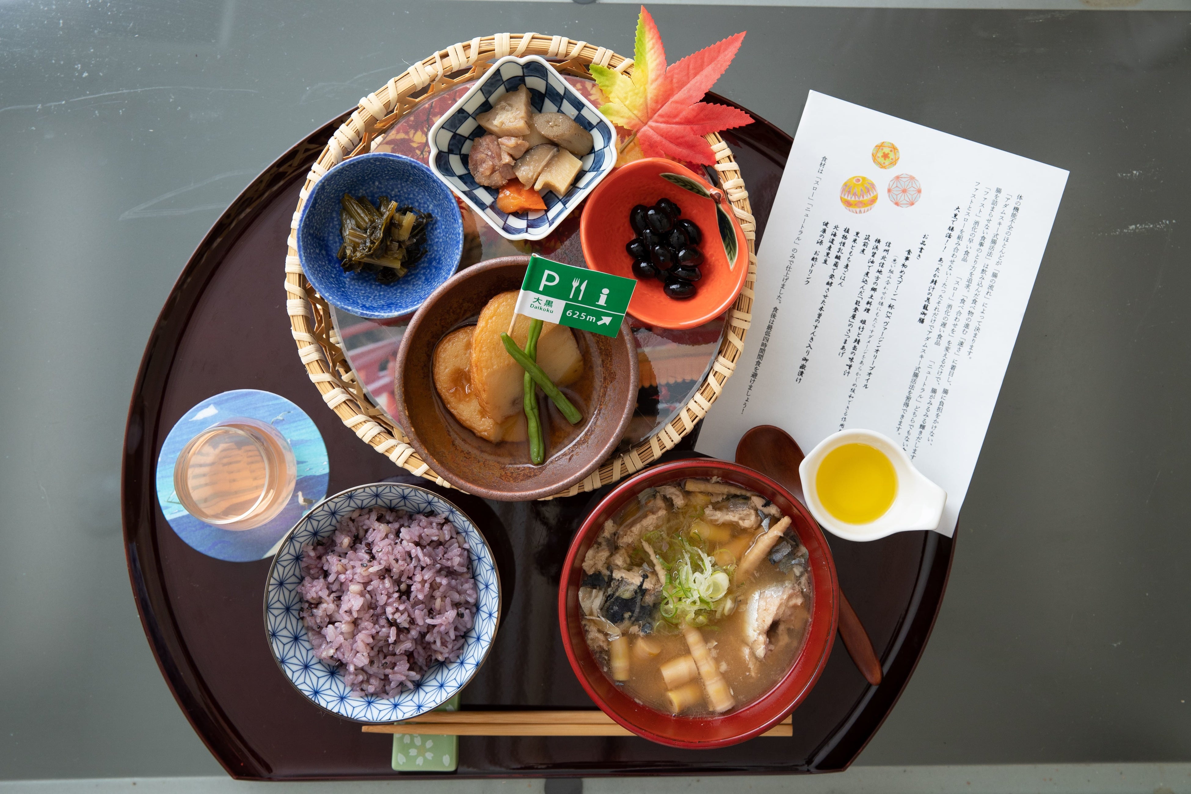 植物性乳酸発酵をさせた乳酸菌が豊富な漬物である信州木曽の「すんき(木曽かぶ菜)入り御嶽漬け」やお酢ドリンク、大豆製品、食物繊維、オリーブオイル等腸内環境を整える食材を詰め込みました。
