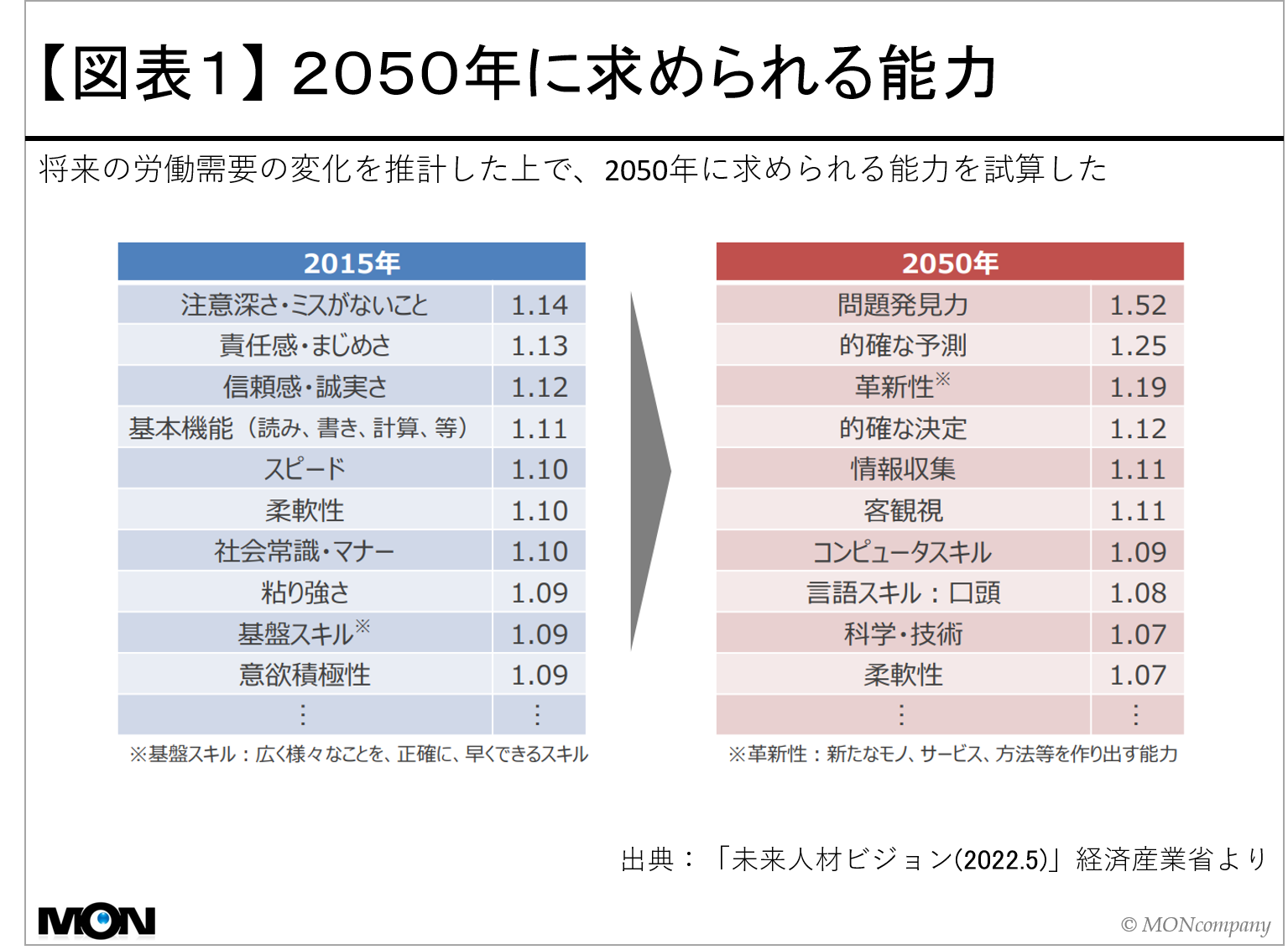 図表1は、経済産業省が未来人材会議にて将来の労働需要の変化を推計した上で、2050年に求められる能力を試算した「未来人材ビジョン(2022年5月)」です。2015年は「注意深さ・ミスがないこと」、「責任感・まじめさ」、「信頼感・誠実さ」、「基本機能(読み、書き、計算、等)」、「スピード」が重視されましたが、2050年には「問題発見力」、「的確な予測」、「革新性」、「的確な決定」、「情報収集」が一層求められると結論付けました。