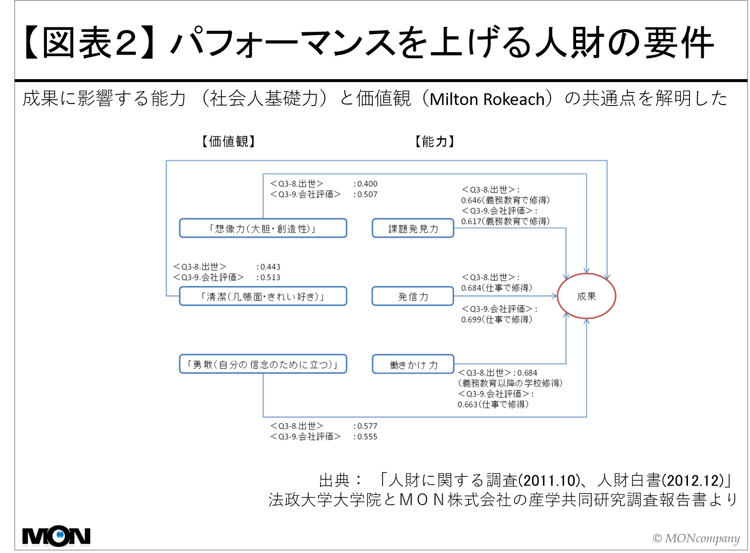 これに対して図表2は、法政大学大学院とMON株式会社が産学共同研究で2011年10月に社会調査を行い、報告書「人財白書(2012年12月)」としてまとめたものです。人財白書は、他の研究調査では得ることのできない点として、能力面 (社会人基礎力/経済産業省)と、価値観(Milton Rokeach 1918-1988/13の手段価値)からパフォーマンスを上げる人財の共通項を分析した研究調査報告書です。本研究で解明された3つの能力「課題発見力」、「発信力」、「働きかけ力」、と3つの価値観「想像力(大胆、創造性)」、「清潔(几帳面、きれい好き)」、「勇敢(自分の信念のために立つ)」は、未来人材ビジョンが示す上位5つの意識・行動(問題発見力、的確な予測、革新性、的確な判断、情報収集)と重なることが分かります。