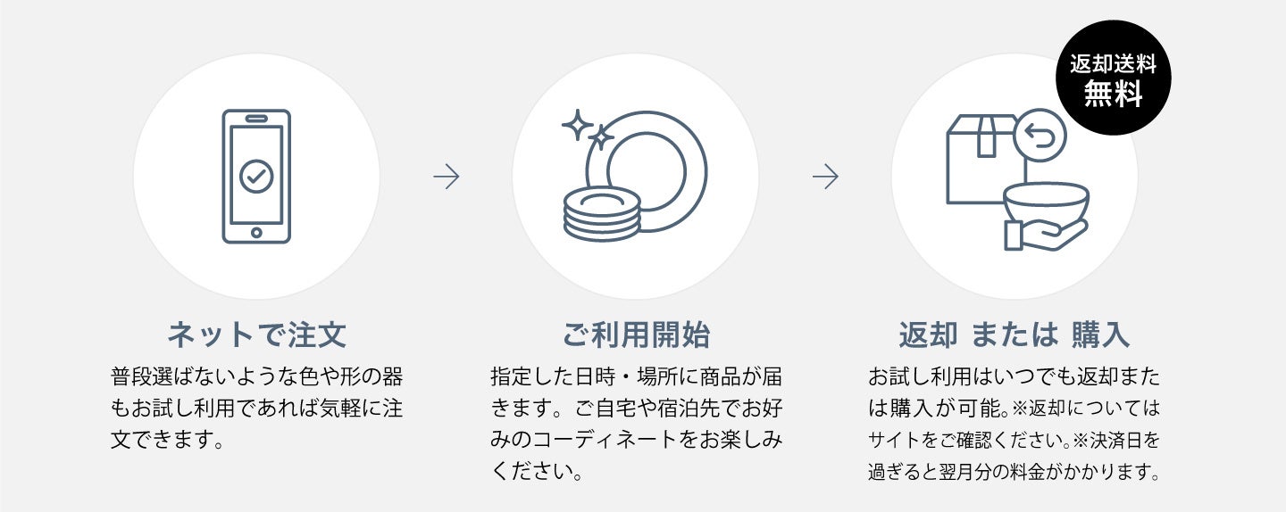 本サービスでは、すべて新品の伝統和食器を1か月から「お試し利用」いただけます。普段は手が出にくいサイズや色の食器にもチャレンジしやすく、使ってみてから購入を検討できるため失敗するリスクがありません。実際に使ってみて気に入ればいつでも「購入」、不要であればいつでも「返却」ができる新しいリースの形です。