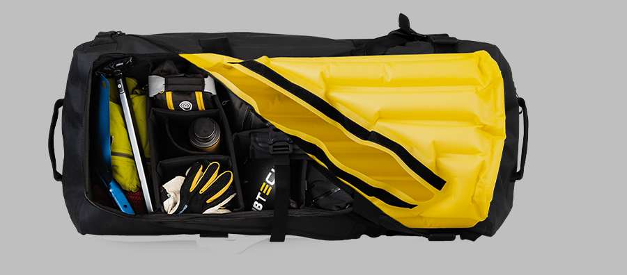 空気を入れてクッション状にすることで衝撃から守ります。55Lサイズにぴったり入る仕様です。