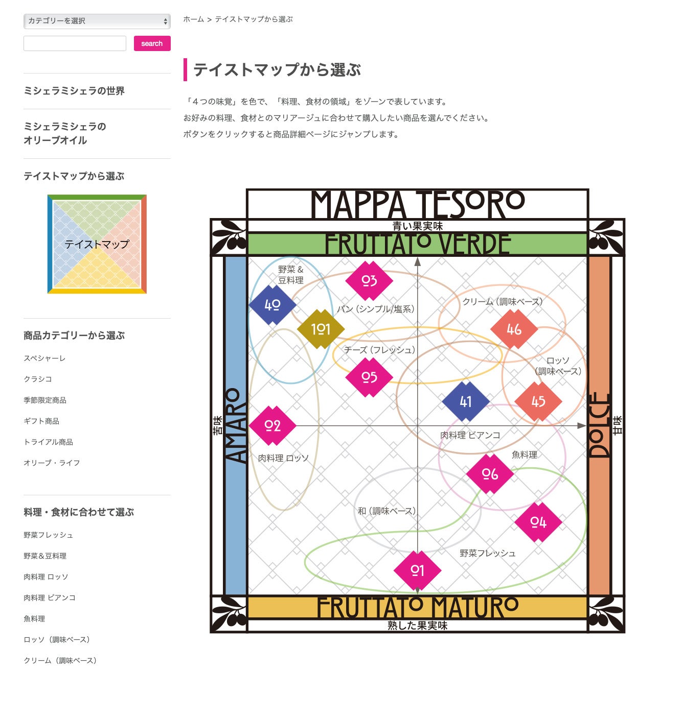 さらに、さまざまな料理や季節の食材に合うオリーブオイルをわかりやすく楽しく選ぶために独自のテイストマップ(https://miscela-miscela.com/?mode=f4)をご用意しています。イタリアの基準や味覚研究機関の手法による「4つの味覚」を4色の領域で表現し、さらに「料理、食材の領域」をそれぞれゾーン化し、その上に商品を落とし込むことで「味の特徴」と「料理、食材とのマッチング」が直感的に分かり、「料理、食材」から商品を選べるようになっています。