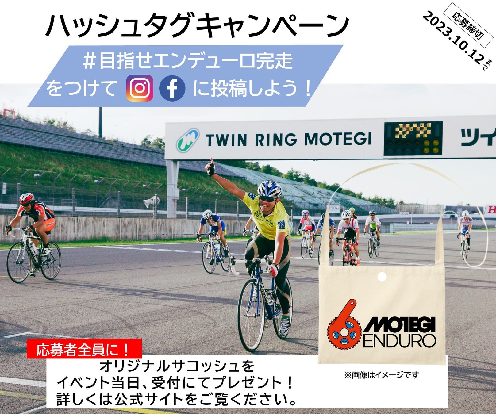「目指せエンデューロ完走!SNSキャンペーン」を実施します。ハッシュタグ「#目指せエンデューロ完走」をつけて、ご自身のサイクル写真or動画、そして意気込みコメントとともにインスタグラムorフェイスブックへ投稿してください。写真や動画は過去のものでもOKです。皆さんの入魂の1枚を投稿ください。意気込みを見せつけてくれたかたにはもれなく全員にオリジナルサコッシュをイベント当日に受付にてプレゼントします。