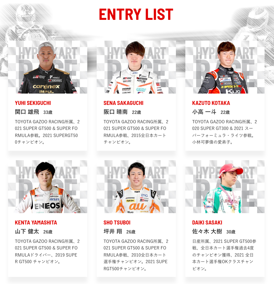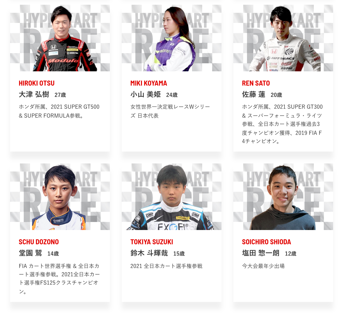 公式戦デビューの12歳のレーサーや、F1レーサーの愛弟子、全日本カート選手権チャンピオン、国内最高峰のカーレース スーパーGTのシリーズチャンピオンなど、さまざまなジャンルのレーサーが参戦。