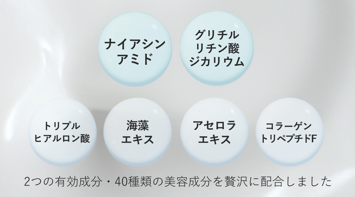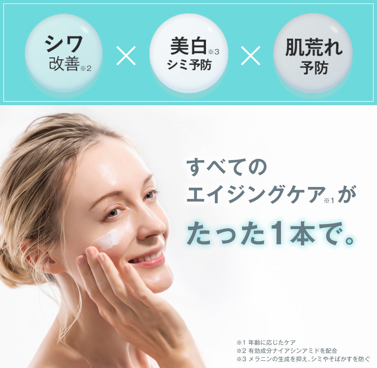 2種の有効成分(ナイアシンアミド、グルチルリチン酸ジカリウム)が、シワ改善*3・美白(シミ予防)*2・肌荒れ防止の薬用効果がアプローチ。有効成分がお顔全体、及び気になる目元やほうれい線を改善。