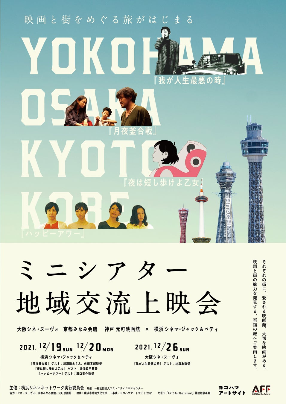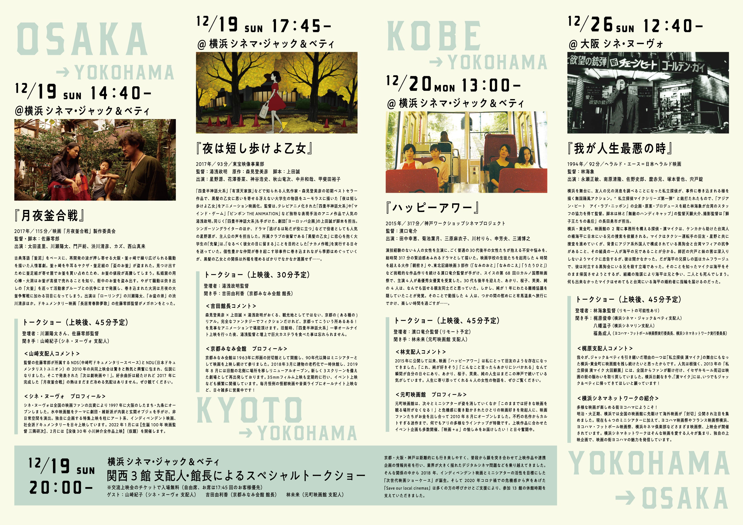 2回目となる今回は、関西のミニシアターシーンを盛り上げているシネ・ヌーヴォ(大阪)、京都みなみ会館、元町映画館(神戸)と、12月21日に開館30周年を迎えるシネマ・ジャック&ベティ(横浜)がそれぞれの劇場にゆかりの深い作品とともに相互訪問し、上映と支配人&作品ゲストを交えてのトークショーを行うことで、それぞれの劇場の個性や哲学そして街の魅力を発信します。