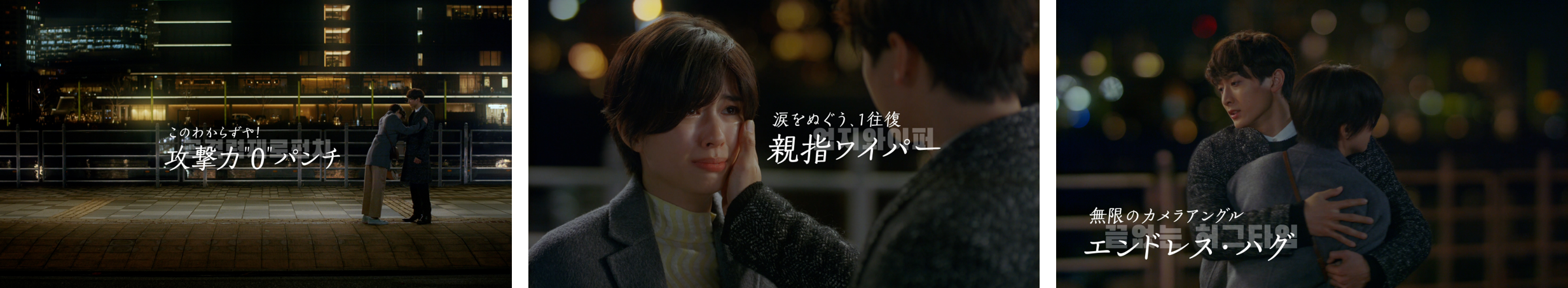 このたび公開する『恋スル!チャミスル』は、「定番、チャミスル」をコンセプトに掲げ、韓国ドラマ内に登場しそうな定番シーンや演出をふんだんに盛り込んだWEB CMです。俳優の佐久間由衣さんと小関裕太さんが、全10シーンを通して、彼女の涙を親指で拭う「親指ワイパー」や、母からの突然の電話「オモニ・ブロック」、酔った帰り道で彼に「おんぶタクシー」されながらの「うっかり告白」、彼がシャワーを浴びながら思い悩む「苦悩のシャワー」など、様々な韓国ドラマ“あるある”シーンを熱演。さらに、「全力スローモーション」や、「エンドレス・ハグ」など、映像演出面にも”あるある”をふんだんに詰め込みました。