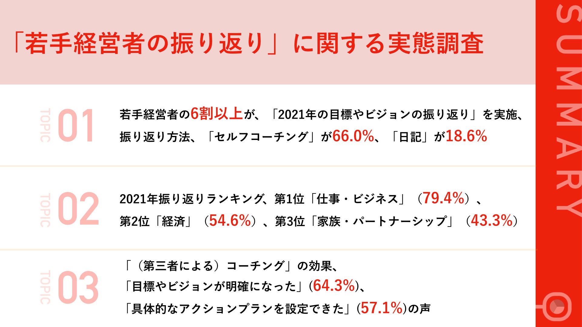 2022年を迎え、2021年度のような成果、成長が得られたか、またあるいは新年どのような目標やビジョンを示すかについて考える時間を作った経営者も多いと思います。一方、今回の調査では、3割強の経営者が昨年の振り返りを実施していない事実が判明し、振り返りを実施する経営者でも、約7割はセルフコーチングを実施していることがわかりました。第三者による客観的なコーチングを取り入れることは、自身では気づけない新たな視点を得ることにも繋がり、新年度に一気にスタートダッシュするための戦略的なビジョンを立てるのに有効でしょう。
