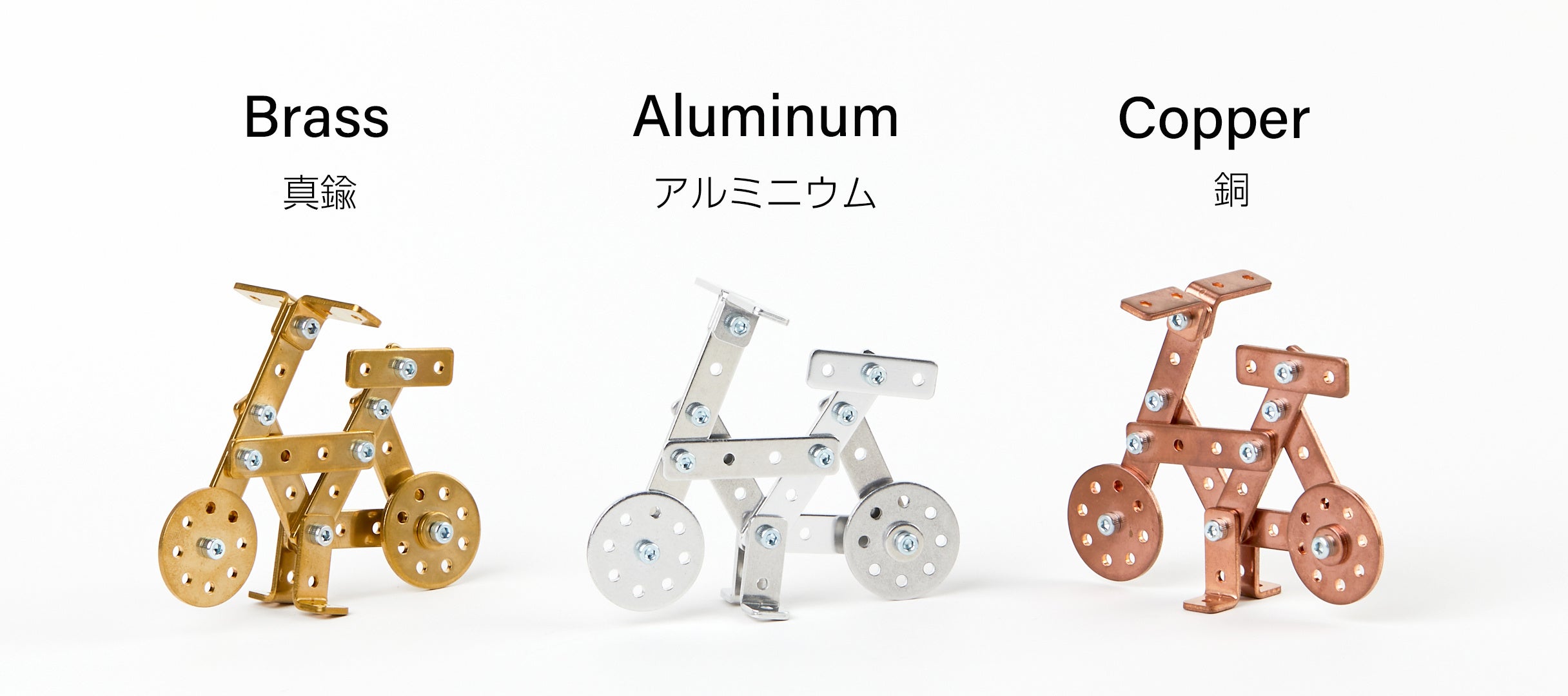 銅と真鍮は、生地の表面が空気や手に触れることにより酸化して経年変化(エイジング)する素材です。ヴィンテージテイストに表情を変えていく独特の風合いをお楽しみください。
