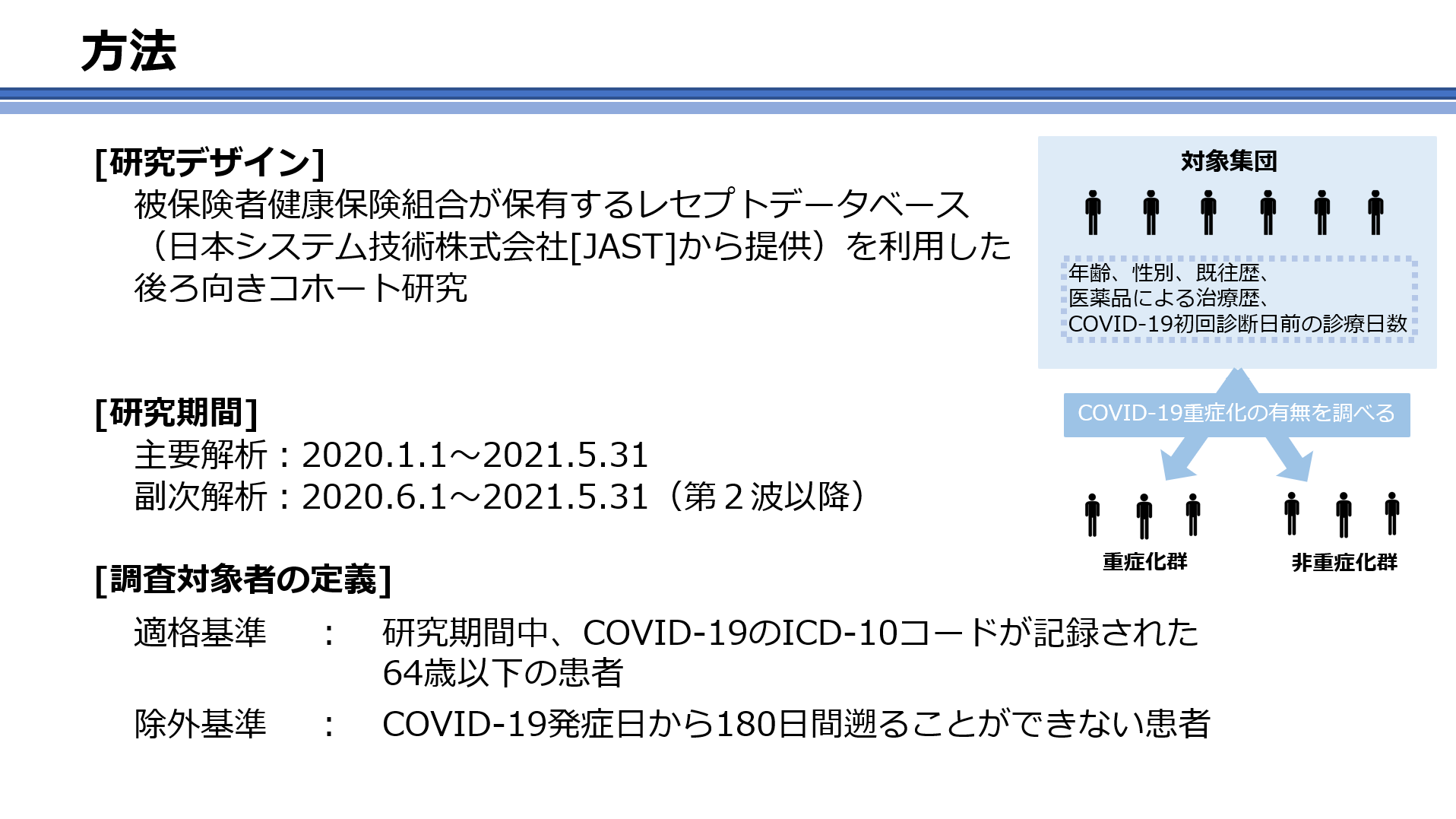 診療報酬データベースを用いたCOVID-19患者の重症化予測モデルの構築、及び重症化因子の特定