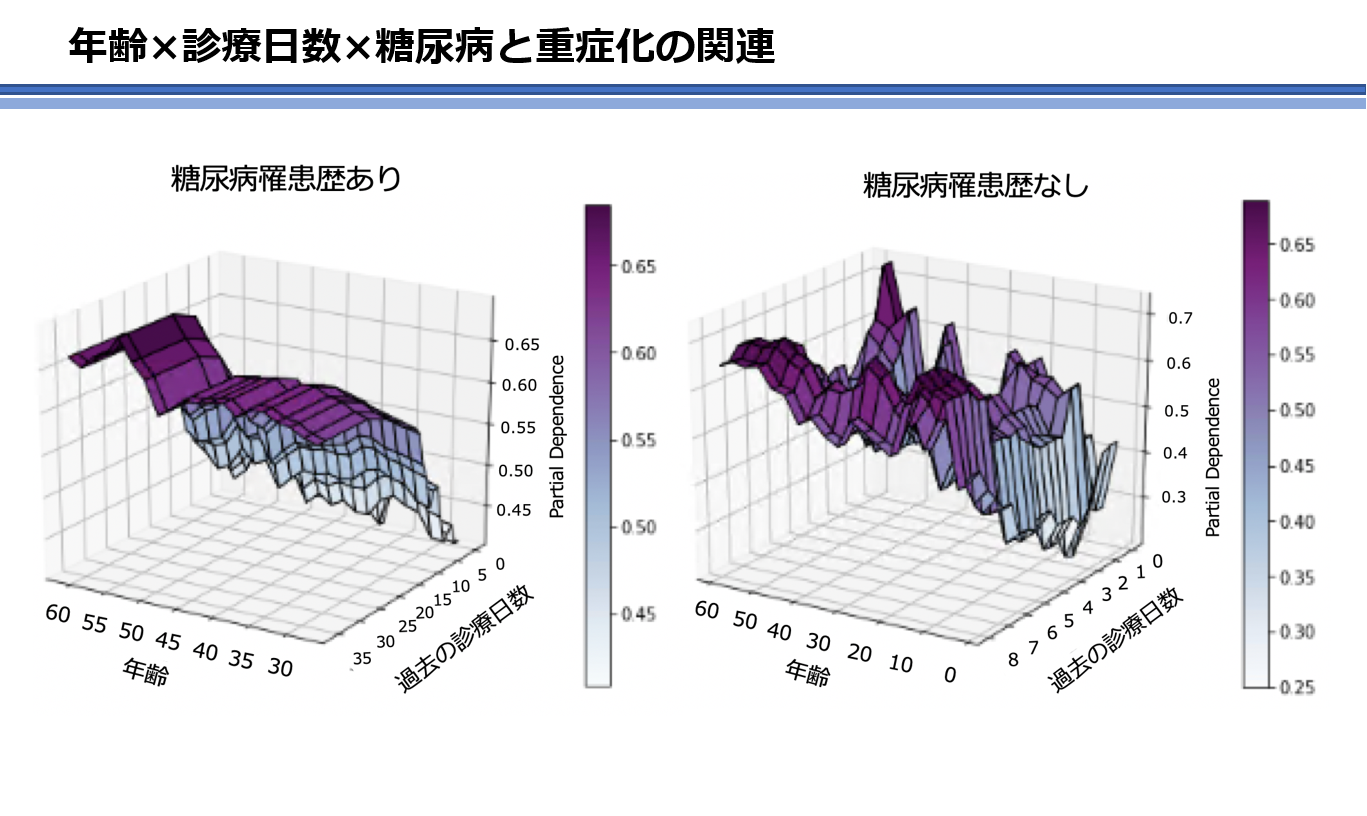 この研究結果では、「年齢が高いと重症化しやすい」「糖尿病に罹患していると重症化しやすい」等、報道で見ることの多い傾向に加え、「慢性疾患の組み合わせ」や「健康リスクを抱えていて直近数か月で病院に一度も行かない」という人が重症化リスク増加に繋がるという新規性の高い考察も得ることができました。