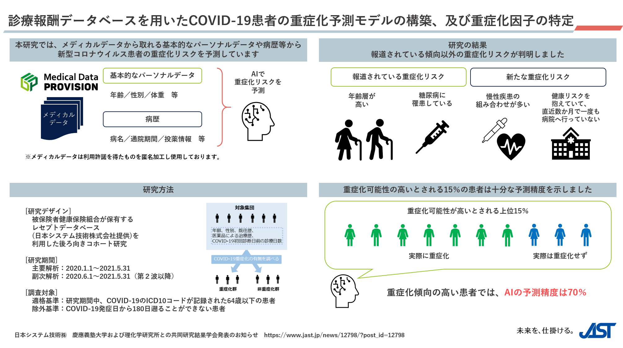 2021年11月27日~28日、学会にて「診療報酬データベースを用いたCOVID-19患者の重症化予測モデルの構築および重症化因子の特定」を演題として発表を行いましたので、お知らせいたします。