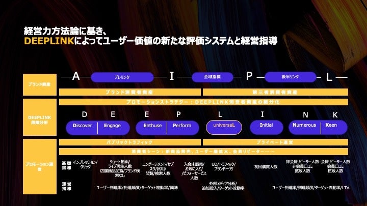 DEEPLINKは「経営力」の理論に基づき、各カテゴリそれぞれのブランドが顧客と深く長期的な関係を築くための評価システムとブランド経営方法を提供しています。