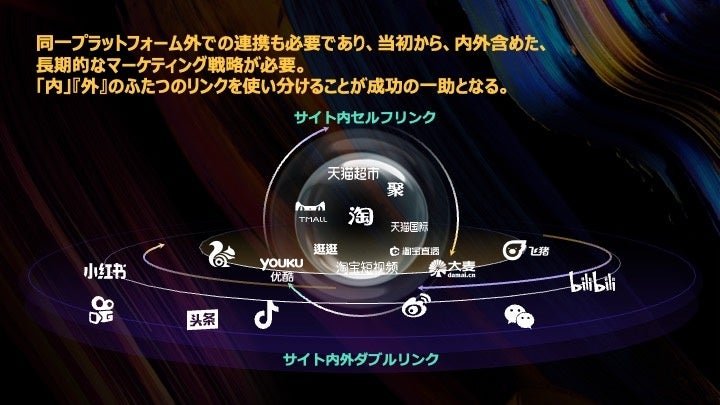2021年9月時点で、淘宝逛逛はすでに半分以上の淘宝コンテンツユーザーに浸透しており、大量の商品が淘宝内で、種をまき(認知を形成し)、草を抜く(購買につなげる)、急速な消費経路を提供しています。Alibaba以外のプラットフォームとの連携も必要であり、当初から、内外含めた、長期的なマーケティング戦略が必要となっています。