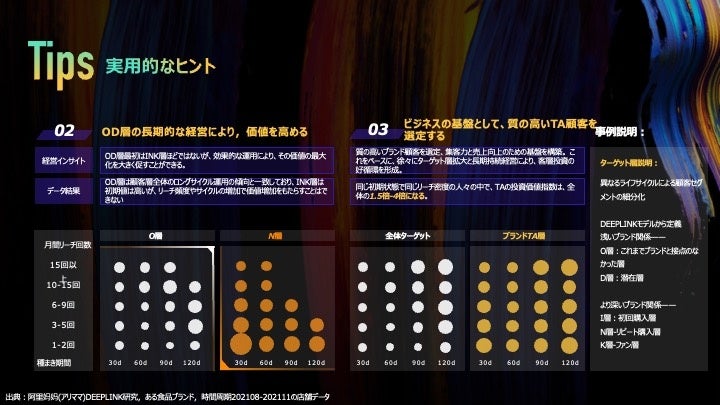 4.効率の良いターゲットがビジネスの大黒柱となる。食品業界の例から見ると、同じリーチ頻度で、そのターゲットの投資対効果は全体の1.5~4倍にのぼった。効率が良いターゲットを絞り、ターゲットの運用と売上の基礎を構築したうえで、ターゲットを広げたり、長期的にターゲット向けの施策をしたりすることで、良好な顧客投資循環が実現できる。