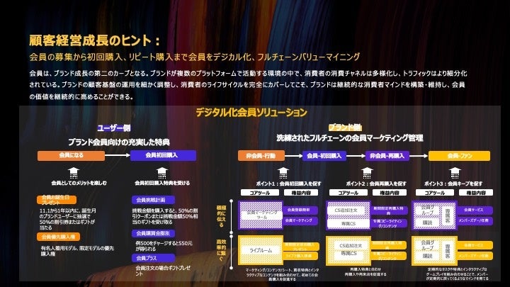競争とチャンスが共存する中で、長期的な視点で、潜在顧客まで含めた精緻な顧客管理を行うことで、会員をデジタル上で募集―初購入―リピート購入を実現し、不確定な顧客の変化を確定的なビジネスリターンに転換する必要があります。