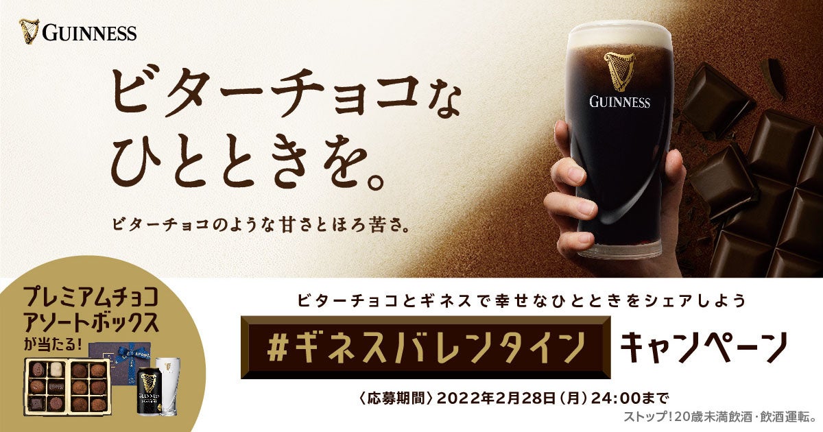 さらに、バレンタインデーを「ギネス」とともにより堪能いただくために、「ギネス」とのペアリングに最適な「プレミアムチョコレートアソートボックス」が抽選100名に当たるSNSプレゼントキャンペーンも開催中です。