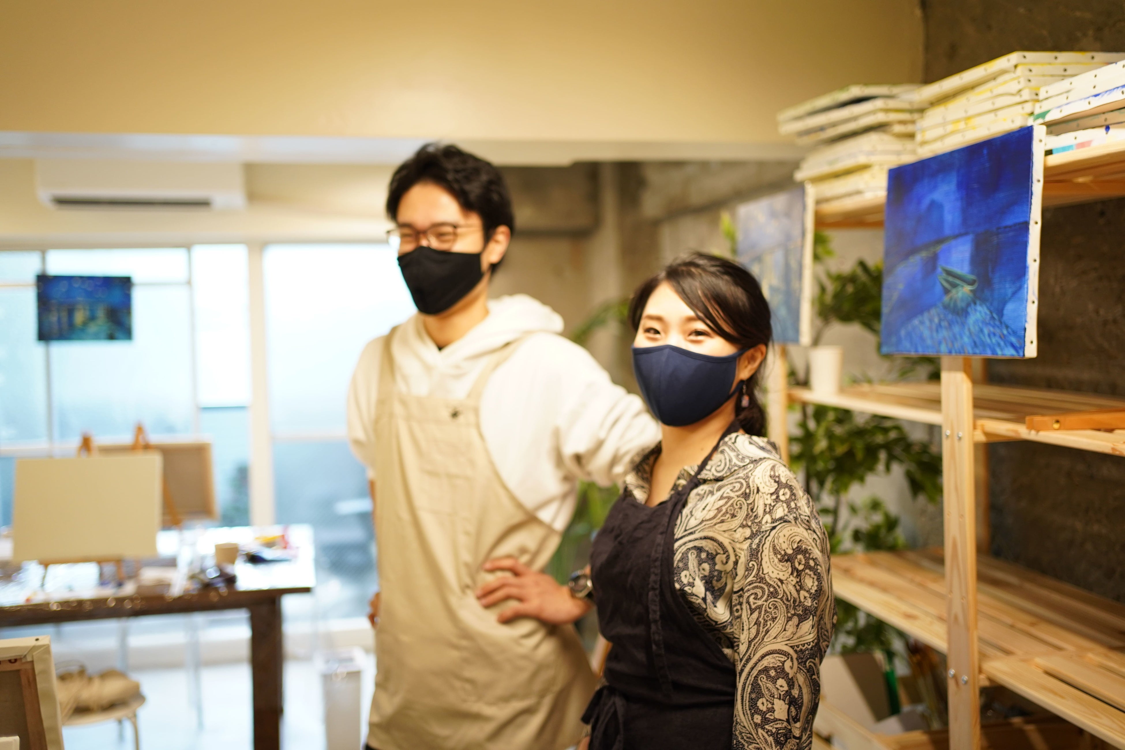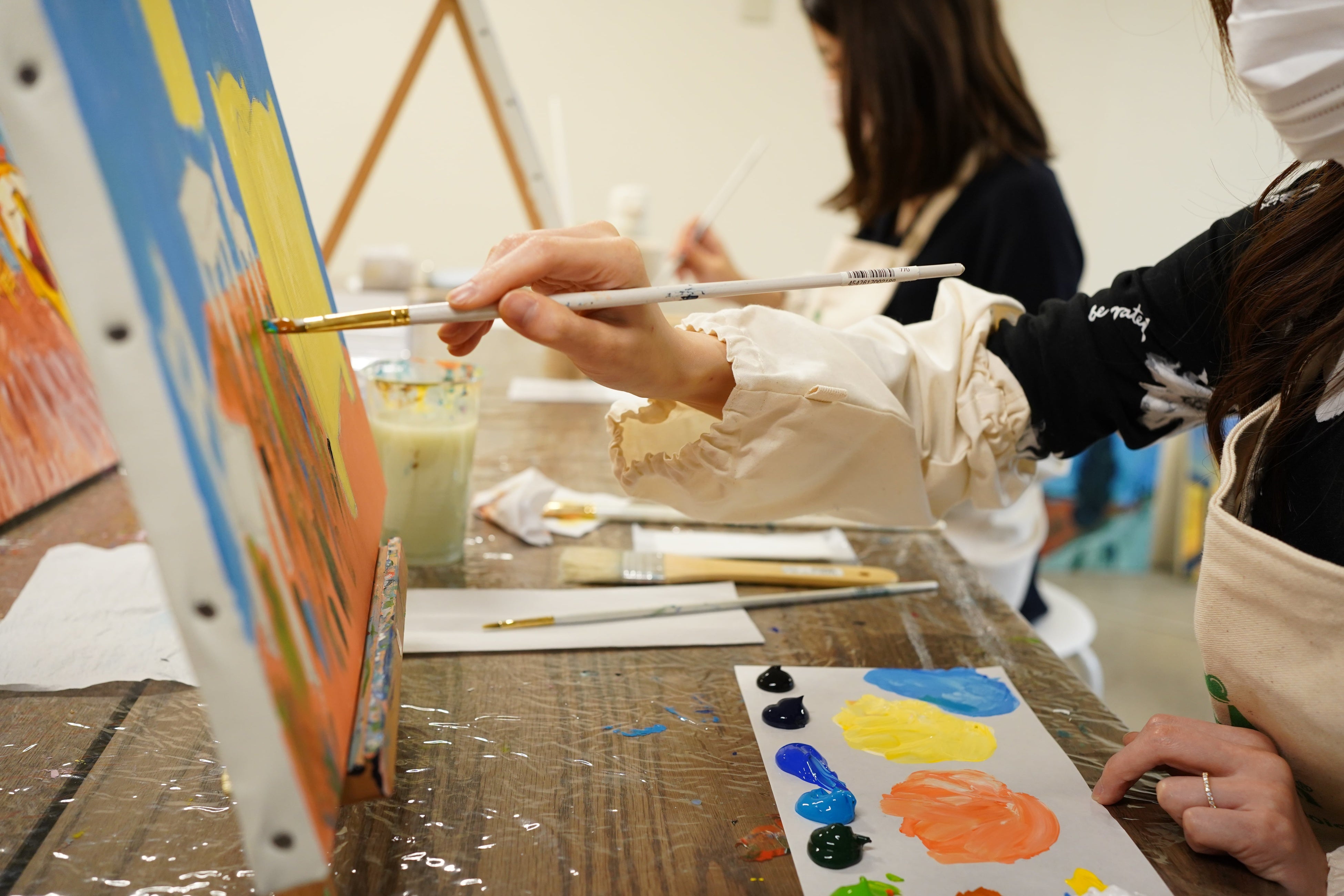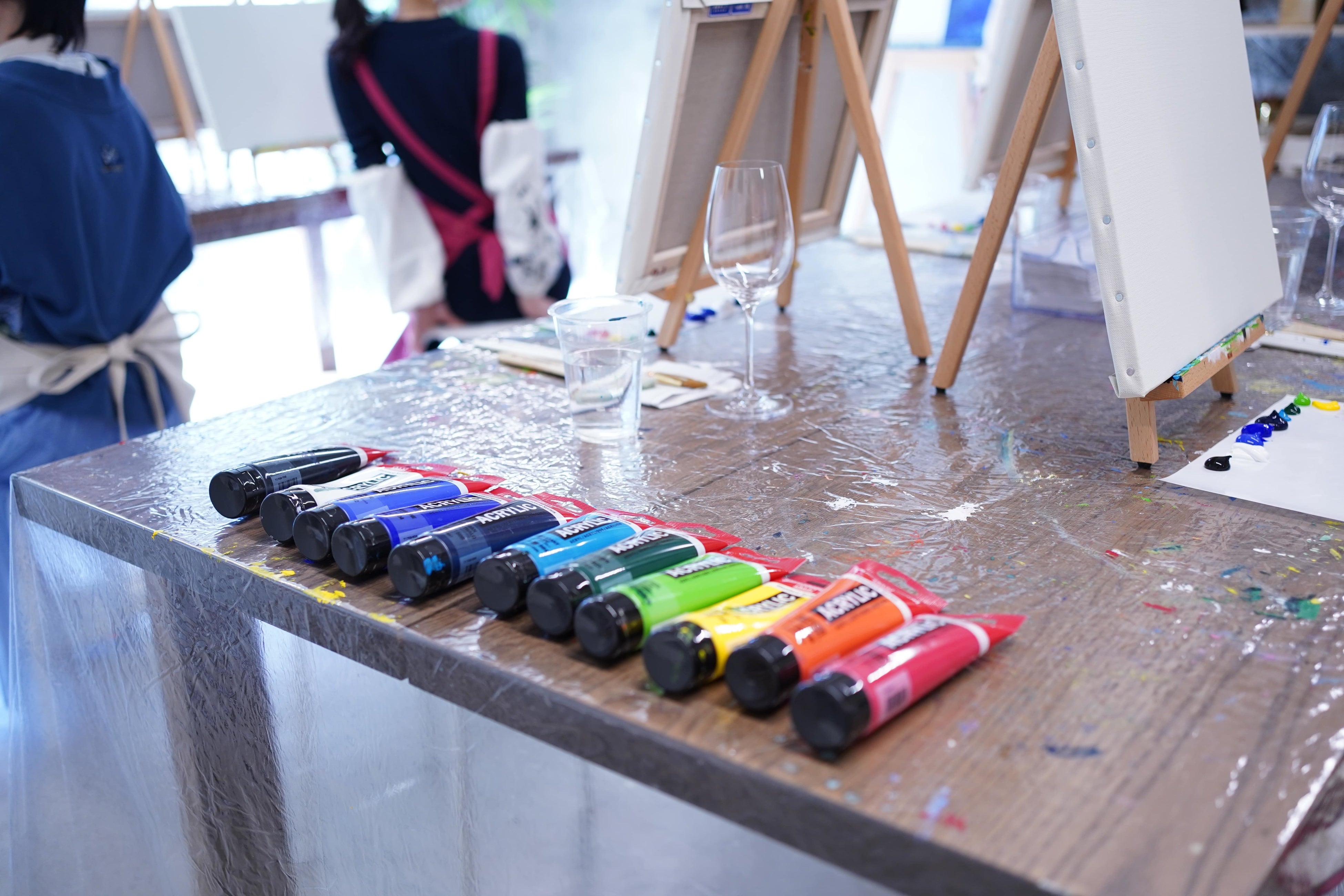 ・絵具や筆、キャンバス等の画材はもちろん、お召し物が汚れないためのエプロンや、持ち帰り用バッグ等も全て、我々がご用意致します。お客様は、ウェブサイトで事前にご予約頂き、当日ご来店頂くだけ。