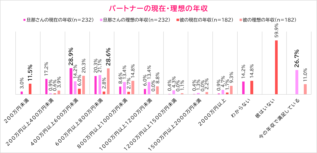 実際はどうなのか「パートナーの現在の年収」を尋ねました。未婚者のうちの59.9%が「彼はいない」と回答したものの、未婚者の彼の年収は「200万円未満」(11.5%)が最多となり、年収の低さが露呈されました。一方、既婚者では「400万円以上600万円未満」(28.9%)が最多でした。また、「わからない」と回答した方も既婚者・未婚者ともに14.5%前後いました。
