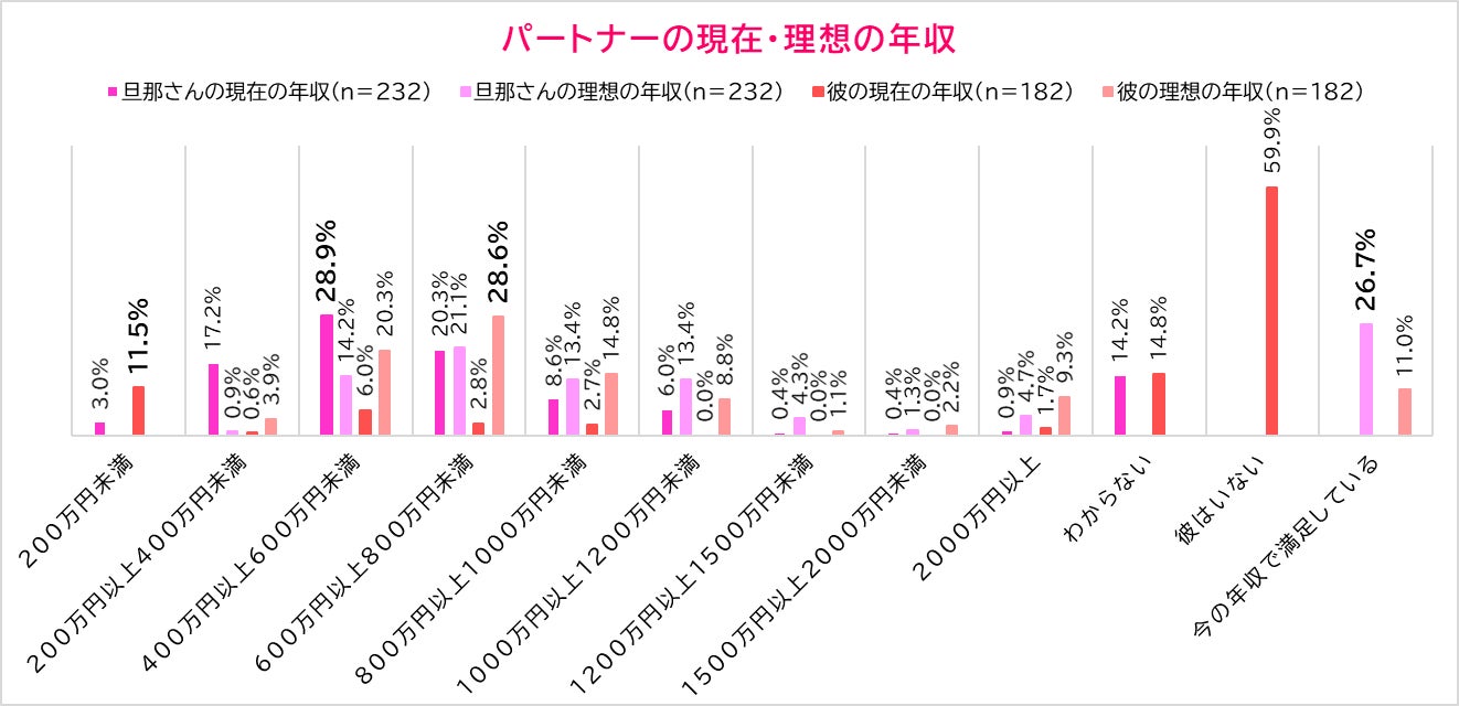 「パートナーの現在の年収、既婚者は「400万円以上600万円未満」、未婚者は「200万円未満」が最多」