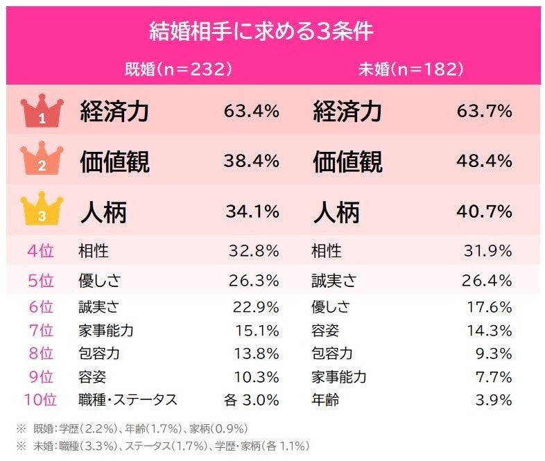 女性が結婚相手に求める条件として「三高」(高収入、高学歴、高身長)という言葉がバブル期に流行しました。そこで、今はどうなのか、既婚者と未婚者では違いがあるのか、「結婚相手に求める3条件」を尋ねました。「経済力」(既婚:64.4%。未婚:63.7%)が断トツの1位となり、2位「価値観」(既婚:38.4%、未婚:48.4%)、3位「人柄」(既婚:34.1%、未婚:40.7%)でした。容姿や学歴は下位でしたが、女性が結婚相手に経済力を求めることは30年経った今でも変わっていないことがわかりました。