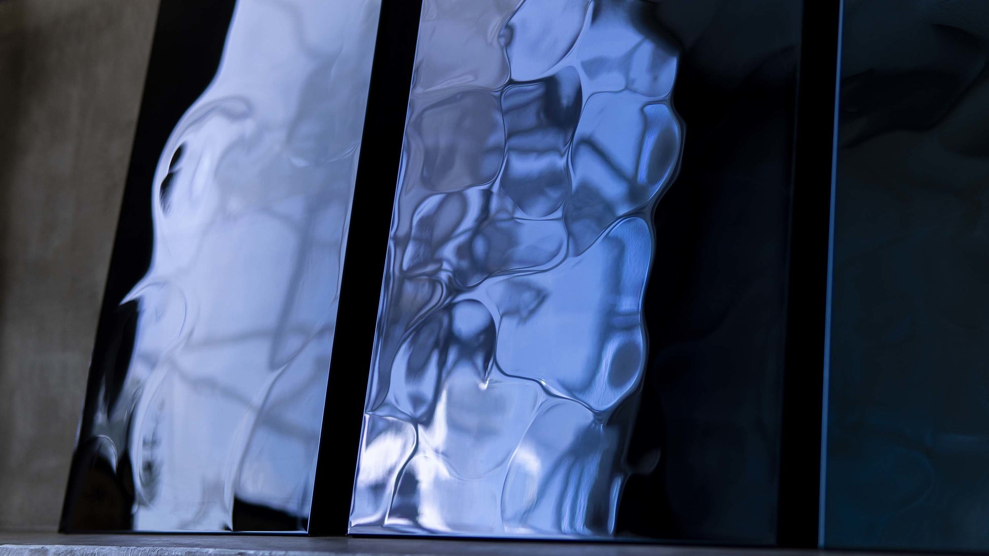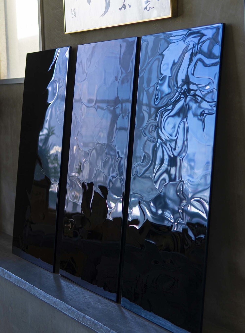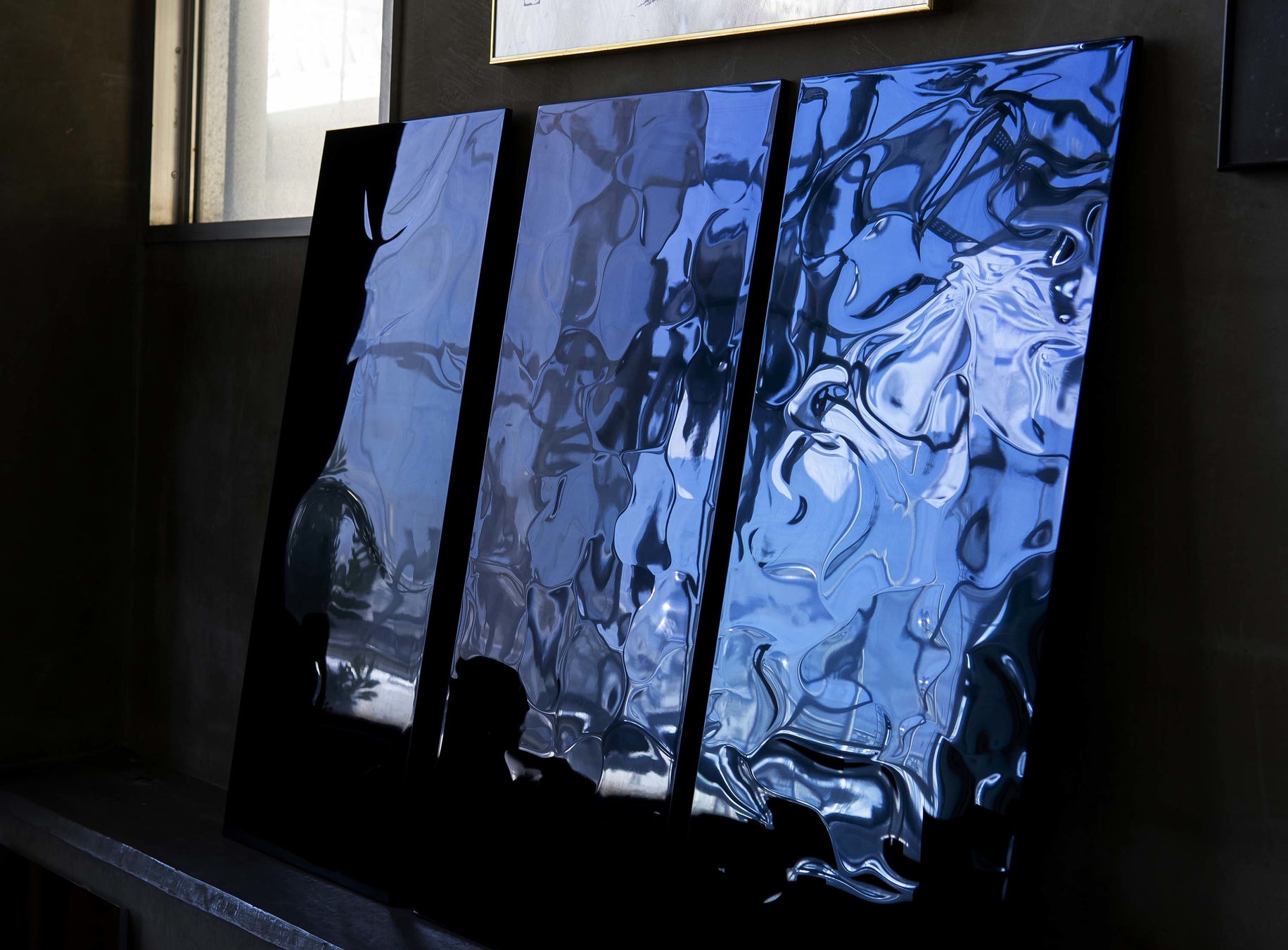 第一弾として内装の壁面や天井材にご好評いただいております“ミステリアスステンレスミラー”シリーズ「Ripples(リップルス)」 「Jeux d’eau(ジュ・ドー)」 「水明(スイメイ)」 の3種のカラーバージョン(ネイビーブルー)を先行リリースいたします。 パネルは壁面材や天井材として使用しやすいように曲げ加工を行い、強度と施工性を考慮した製品となっております。 また、施工条件に合わせて各種カスタマイズにも対応致しております。