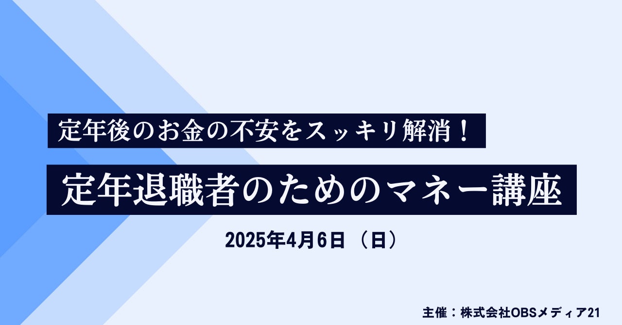 「定年後のお金の不安を解消したい」という多くのお声にお応えし、株式会社OBSメディア21は、2025年4月6日(日)に大分市で定年退職者向けの無料マネー講座を追加開催することを決定しました。前回、予約が取れなかった方、日程が合わなかった方も、この機会にぜひご参加ください。