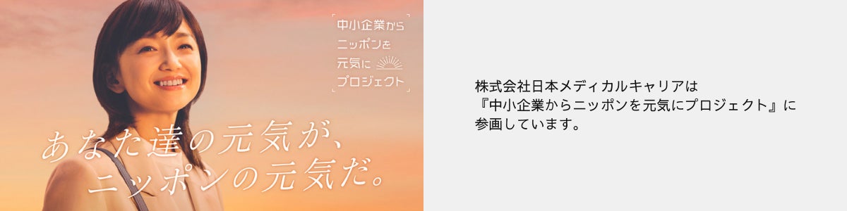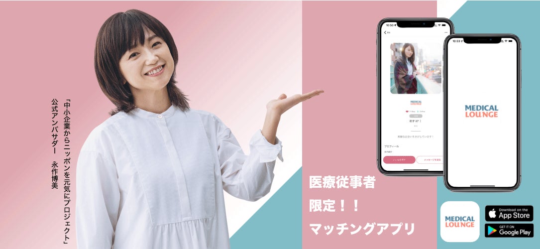 株式会社日本メディカルキャリア(東京都渋谷区:代表取締役 落合宏明)は、「中小企業からニッポンを元気にプロジェクト」の公式アンバサダーを務める永作博美さんをイメージキャラクターとして起用し、医療従事者のためのマッチングアプリ「メディカルラウンジ ~医療でつなげる、つながる~」のプロモーション活動を開始いたします。