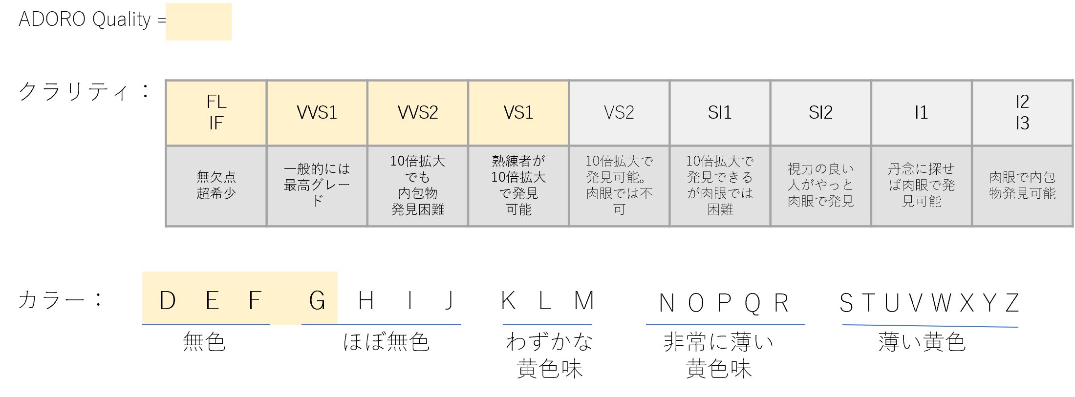 ADOROが選定するダイヤモンドのクラリティはVS1以上、カラーはFまたはG以上とほぼ無色の高いクオリティのダイヤモンドのみを使用しています。