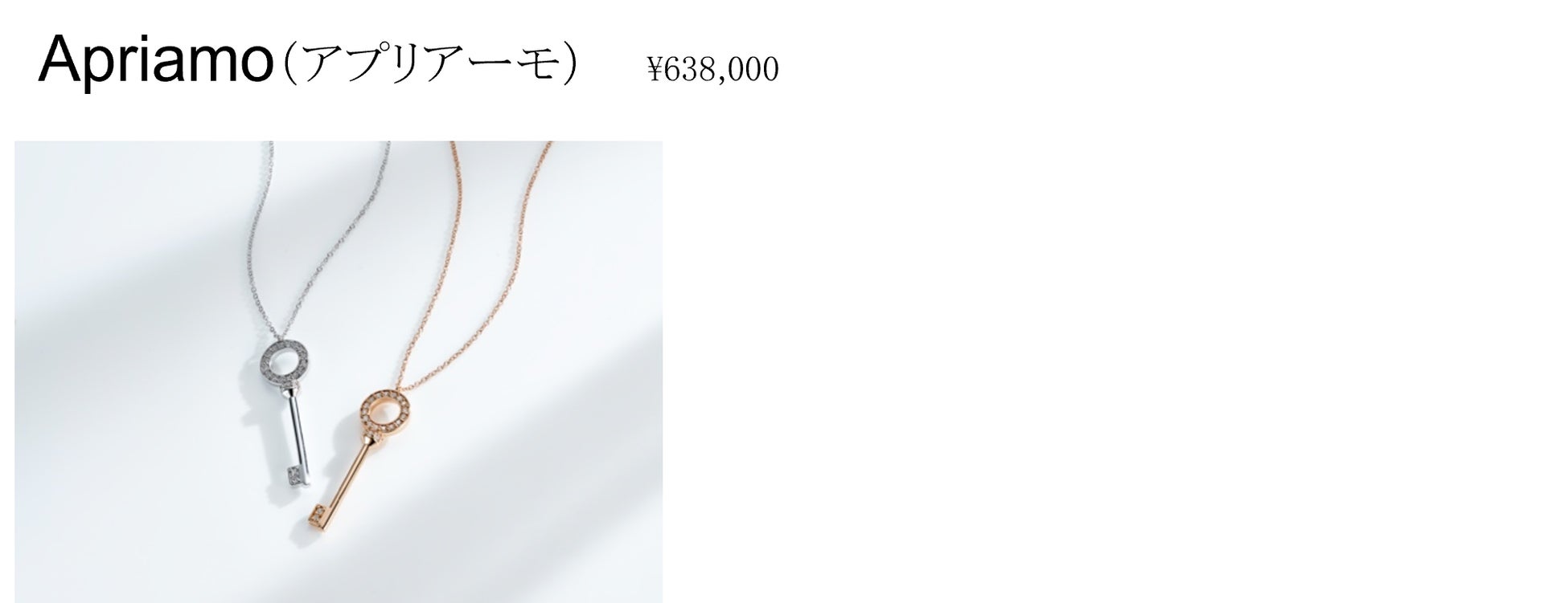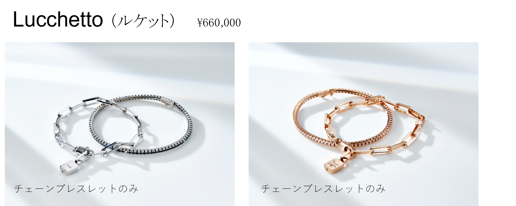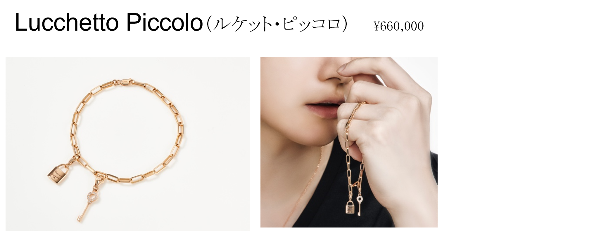 チャームは南京錠とカギの組み合わせになっており、カギ部分はネックレスのラインナップであるApriamoのカギデザインを採用している。