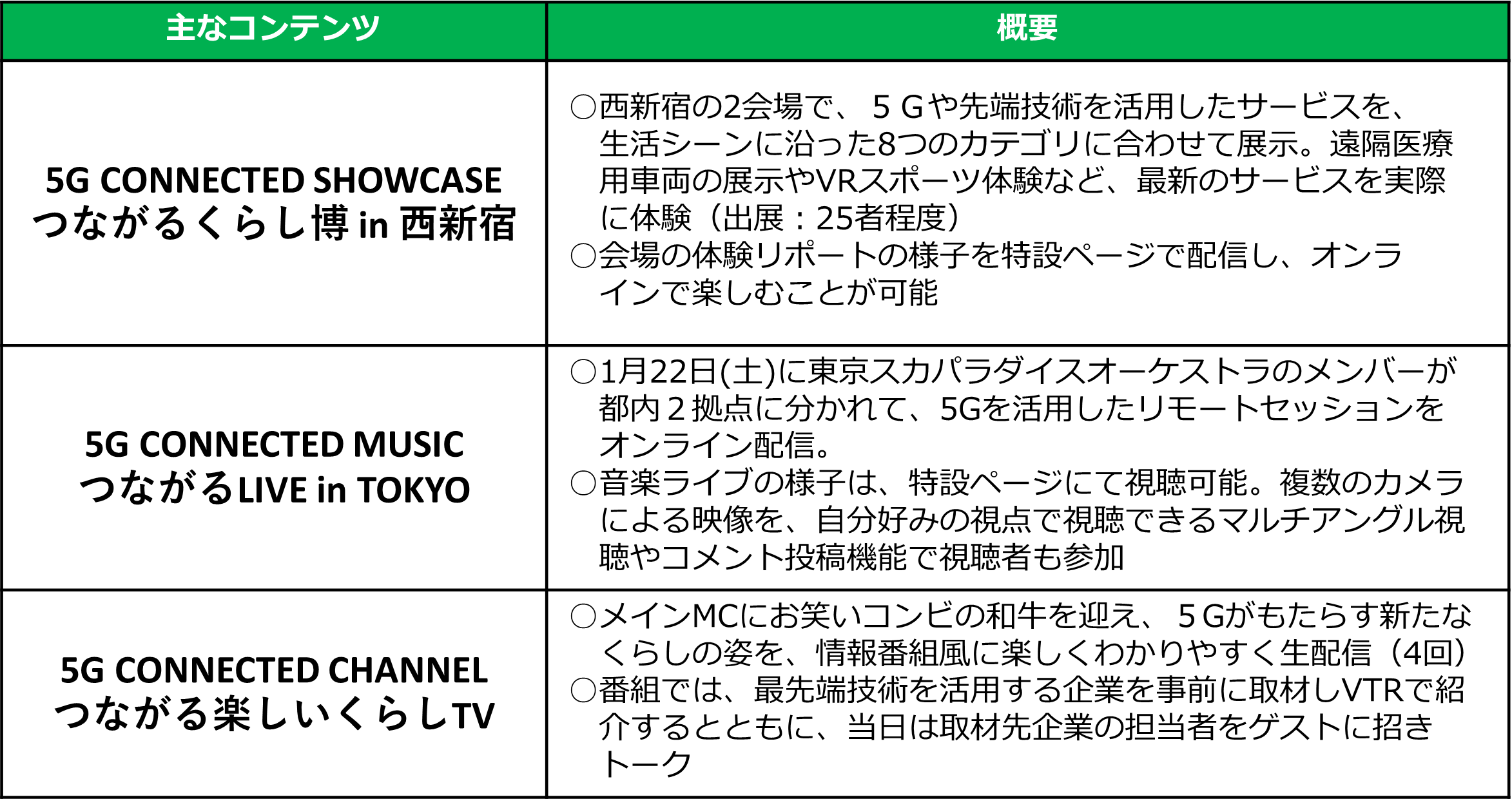 さらに特設サイトでは、22日、23日両日に渡って、生活の中で普及が進む5Gサービスを企業と紐解くトークVTR『つながる楽しいくらしTV』を放送。メインMCにお笑いコンビの和牛を迎え、5Gがもたらす新たなくらしの姿を、情報番組風に楽しくわかりやすく生配信します。
