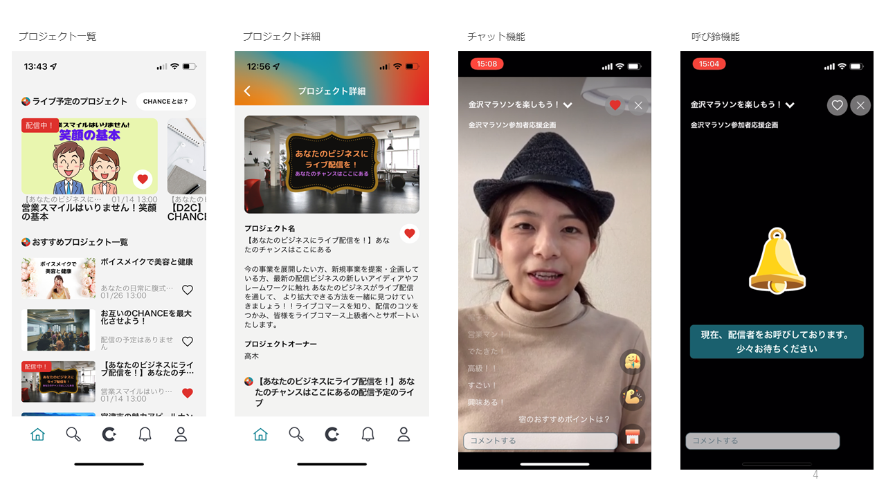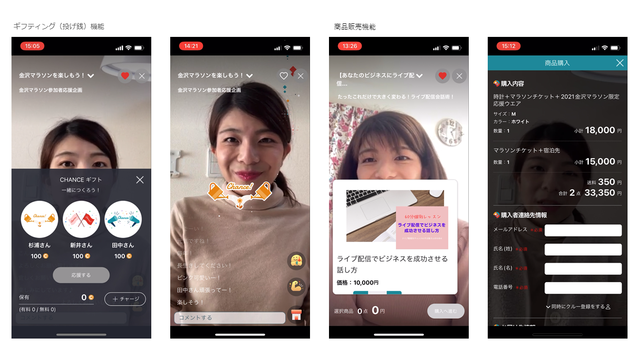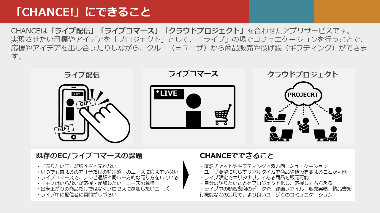 CHANCE!は「①ライブ配信」「②ライブコマース」「③クラウドプロジェクト」を合わせたアプリサービスです。有形商品や無形のサービス、やりたいこと、叶えたいことをプロジェクトとして立ち上げ、ライブ配信を通して、視聴者(CHANCE!ではクルーと呼びます)と共にチャンスを加速していきます。「ライブ」の場でコミュニケーションを行うことで、応援やアイデアを出し合ったりしながら、クルーからの商品購入や投げ銭(ギフティング)が可能です。