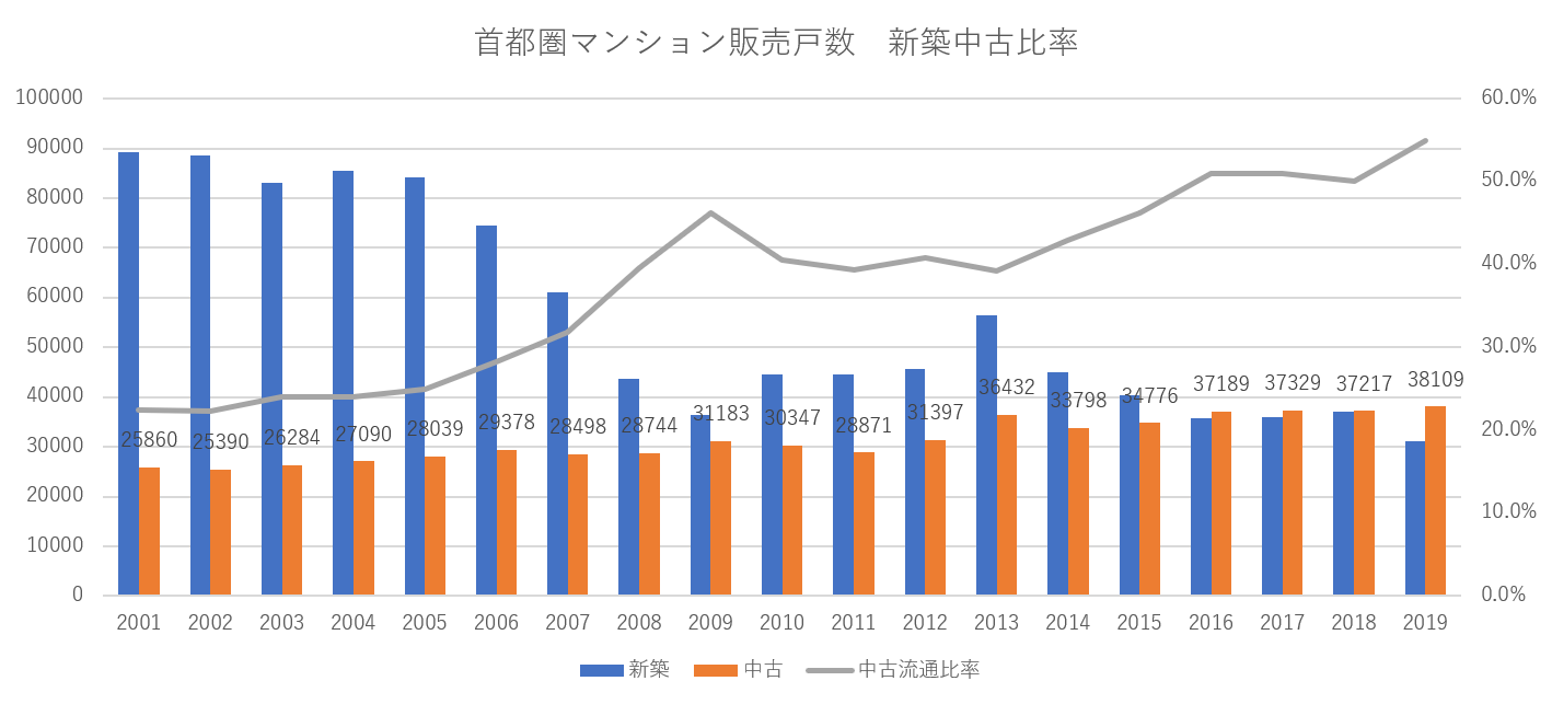 この背景には、国土交通省が中古住宅リフォームトータルプランとして、中古住宅流通、リフォームの市場規模を倍増させる計画を2010年に発表し、中古住宅流通量を増やすための施策を実行したことが影響していると考えられます。2020年時点では、国内の中古住宅流通量は新築住宅流通量と比較して18%とまだまだ少ないものの、首都圏におけるマンション流通量は2016年以降、新築販売戸数と中古流通量が逆転しており、首都圏のマンション流通の55%は既存住宅となっています。
