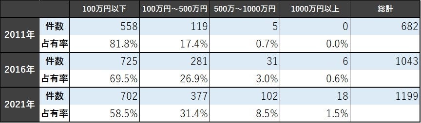 2011年は工事規模100万円未満の現状回復・メンテナンス工事が中古住宅購入時のリフォームの大半を占めていることがわかります。当時は、いわゆるリノベーションと言われる500万円以上の工事は年間5件と全体工事数の1%未満でしたが、2021年には10月までの施工数で120件と全体工事数の10%を占めるまでに増加しています。
