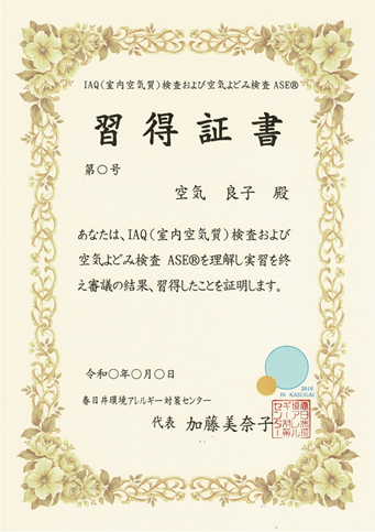 - 検査表2種を作成し、申込書と一緒に事務局(春日井環境アレルギー対策センター)のメール(info@kasugaikankyou.com)にご提出ください。約1か月後に習得証書を発行いたします。