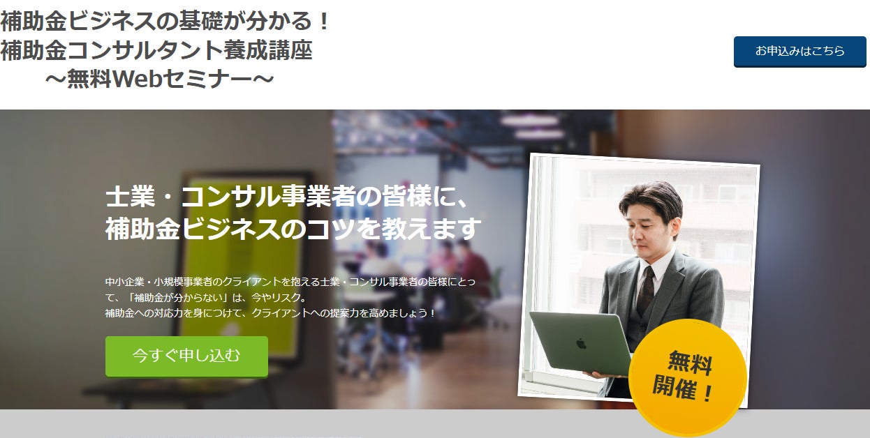 「補助金コンサルタント養成講座」では、補助金ビジネスの基礎についての「無料WEBセミナー」を開催しています。