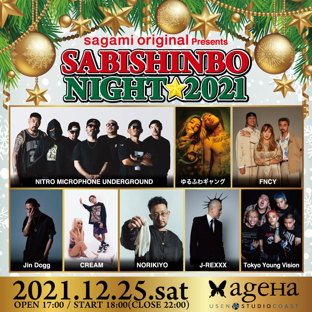 「sagami original presents SABISHINBO NIGHT」が今年は人数を限定した有観客で今週末開催される。例年のオールナイト公演とは違った形(デイタイム)での開催となる今年はNITRO MICROPHONE UNDERGROUND、ゆるふわギャング、FNCY、Jin Dogg、CREAM、NORIKIYO、J-REXXX、Tokyo Young Visionに加えMCにDABO、ちとせよしの(サガミオリジナル002 13代目宣伝大使)も決定し、クリスマスに相応しいに豪華な出演者となっている。