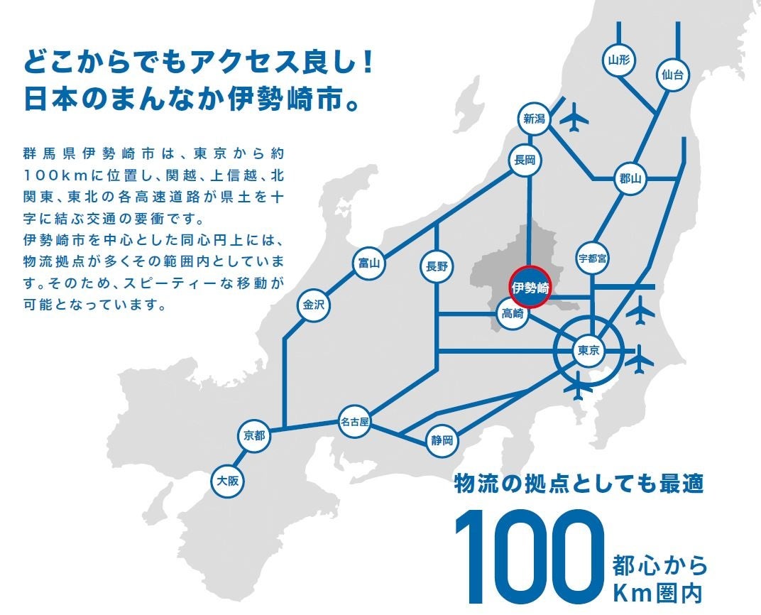 この倉庫が位置する群馬県伊勢崎市は、東京から約100km圏内に位置し、関越道、上信越道、北関東道、東北道の各高速道路に短時間でアクセスできる交通の要所であり、物流拠点として好立地です。