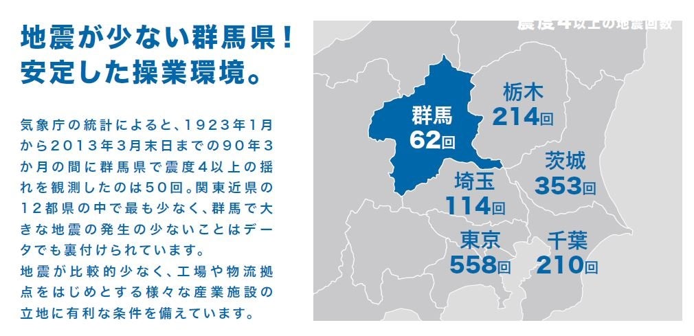 群馬県は関東近県の12都県の中で最も地震発生率が少なく、工場や物流拠点の立地条件を備えています。