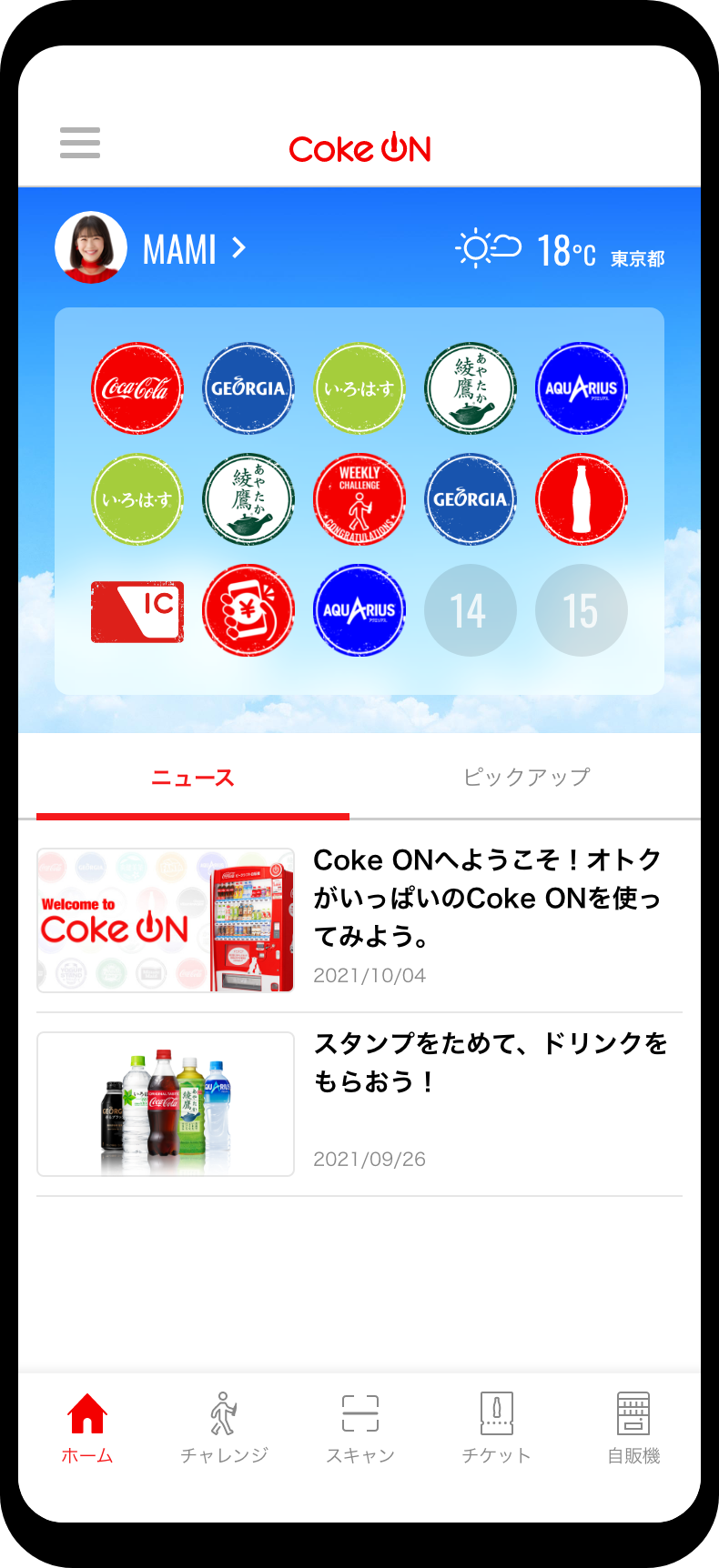 「Coke ON(コークオン)」は、アプリ内でスタンプを15個ためるたび1本分のドリンクチケットを獲得できる、おトクで便利なコカ・コーラの公式スマホアプリです。ドリンクチケットは、お好きなコカ・コーラ社製品1本と無料で交換できます。