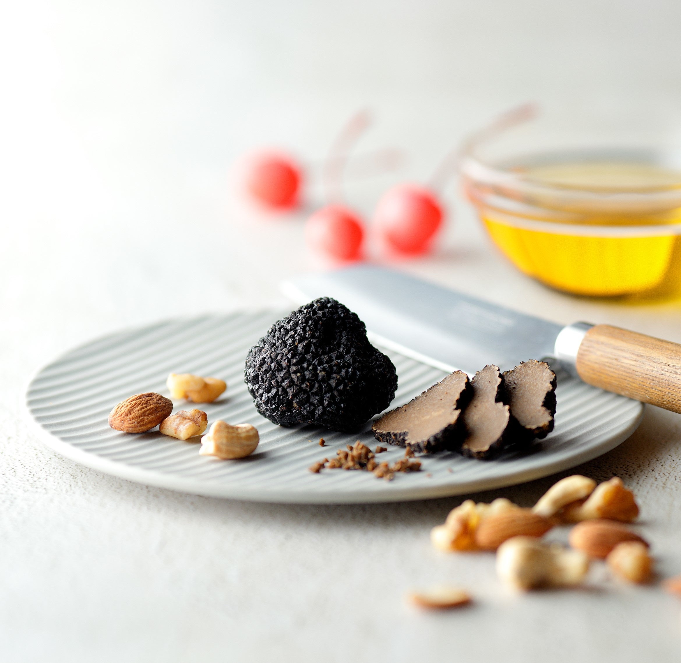 トリュフの本場イタリアの高級黒トリュフを使用。黒トリュフは加熱することで香り立ちが良くなるため、ビンに詰める直前に熱をかけ、立ちのぼる芳醇な香りをまるごと閉じ込めました。はちみつはブルガリア産チェリーはちみつとハンガリー産アカシアはちみつを使用し、フルーティな酸味と爽やかな甘さがトリュフの香りと調和するようオリジナルブレンドで仕上げています。
