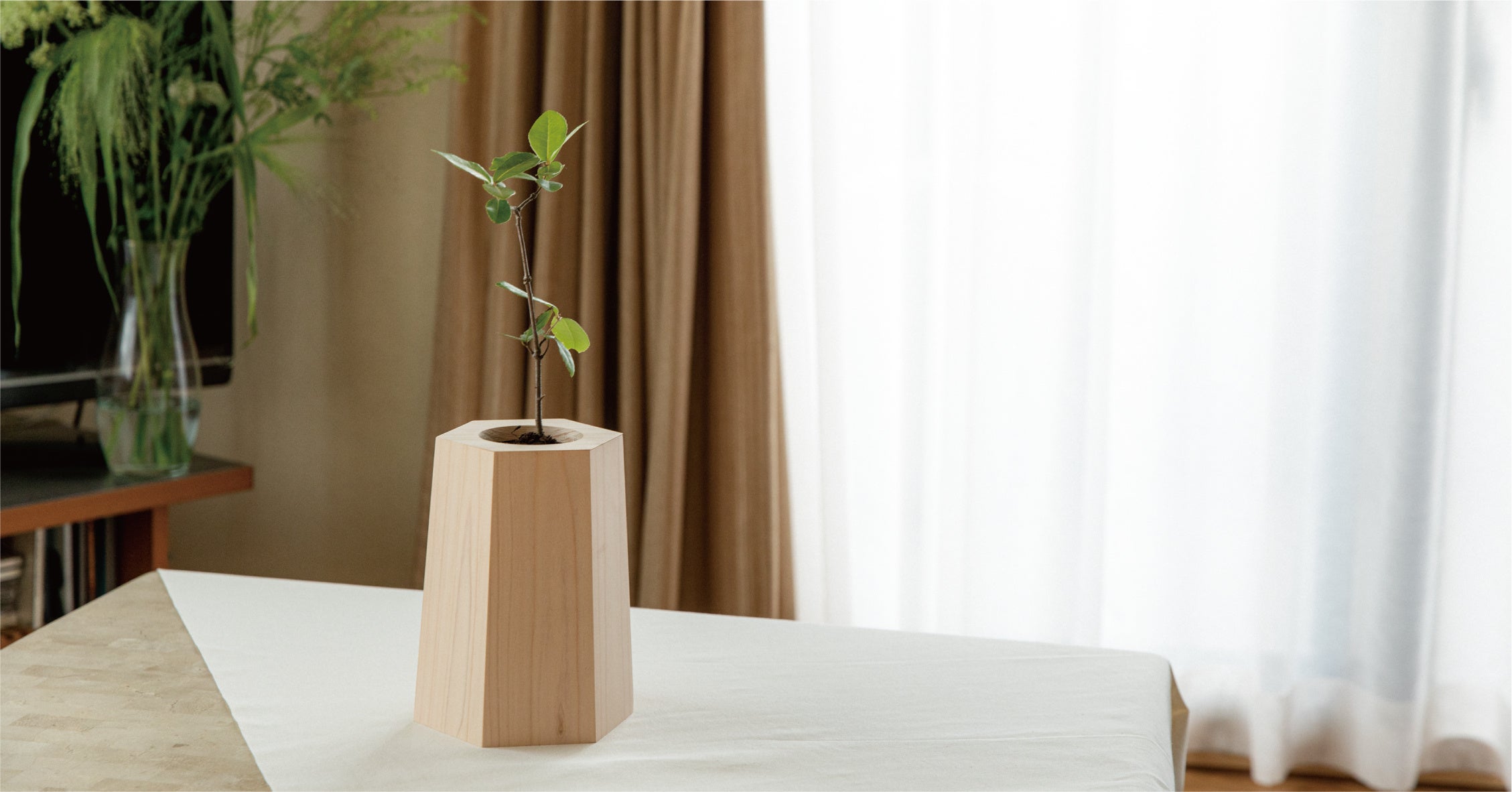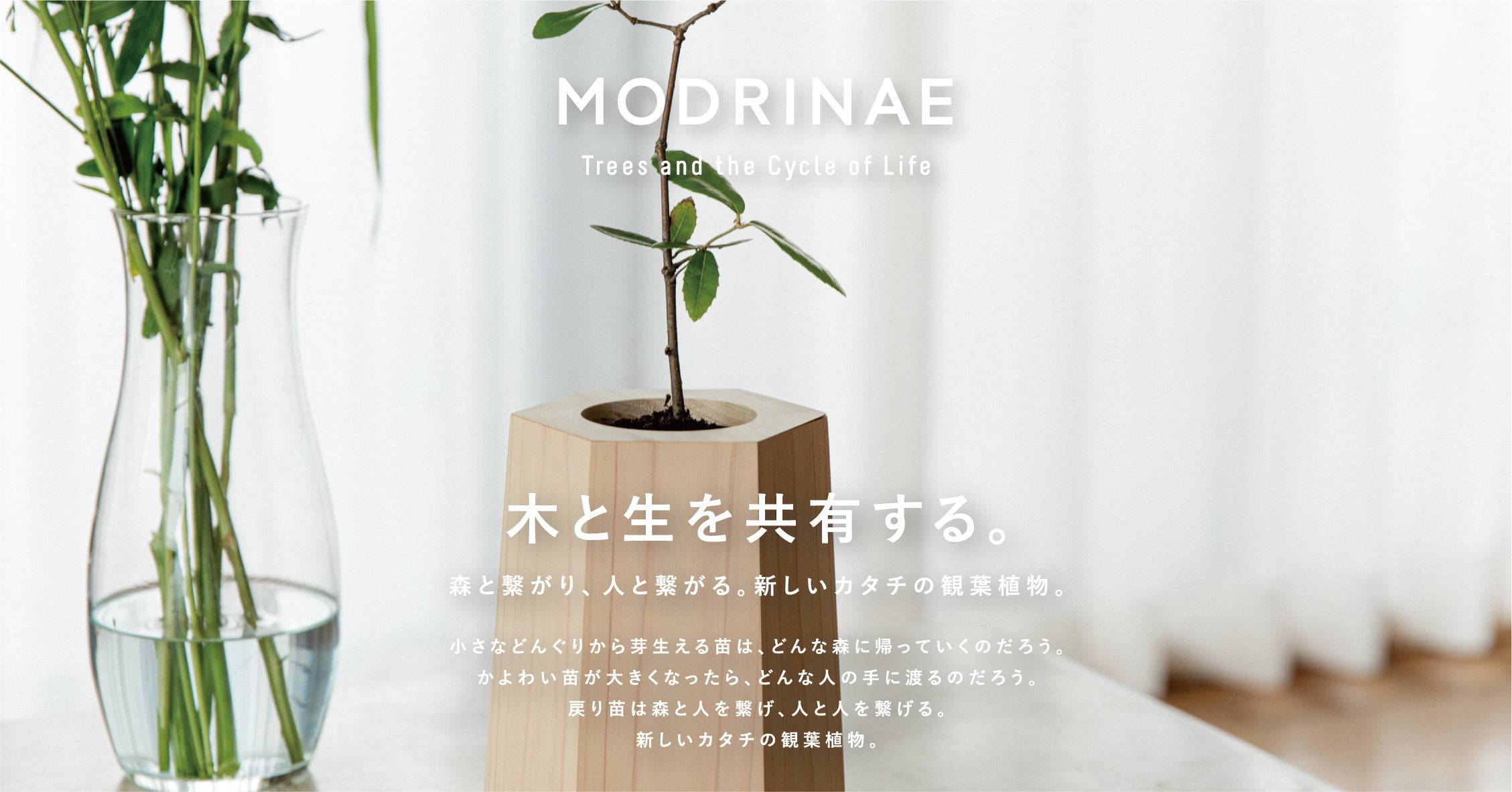 戻り苗は、誰もが山づくりに参加できる新しいカタチの観葉植物です。どんぐりから苗木を育てるセットになっており、購入者の元で育った苗木は、当社が引き取り、山へ植林します。育てる期間は約2年間。その後、苗木が植林される和歌山県の木材を使用した製品を購入することもできます。