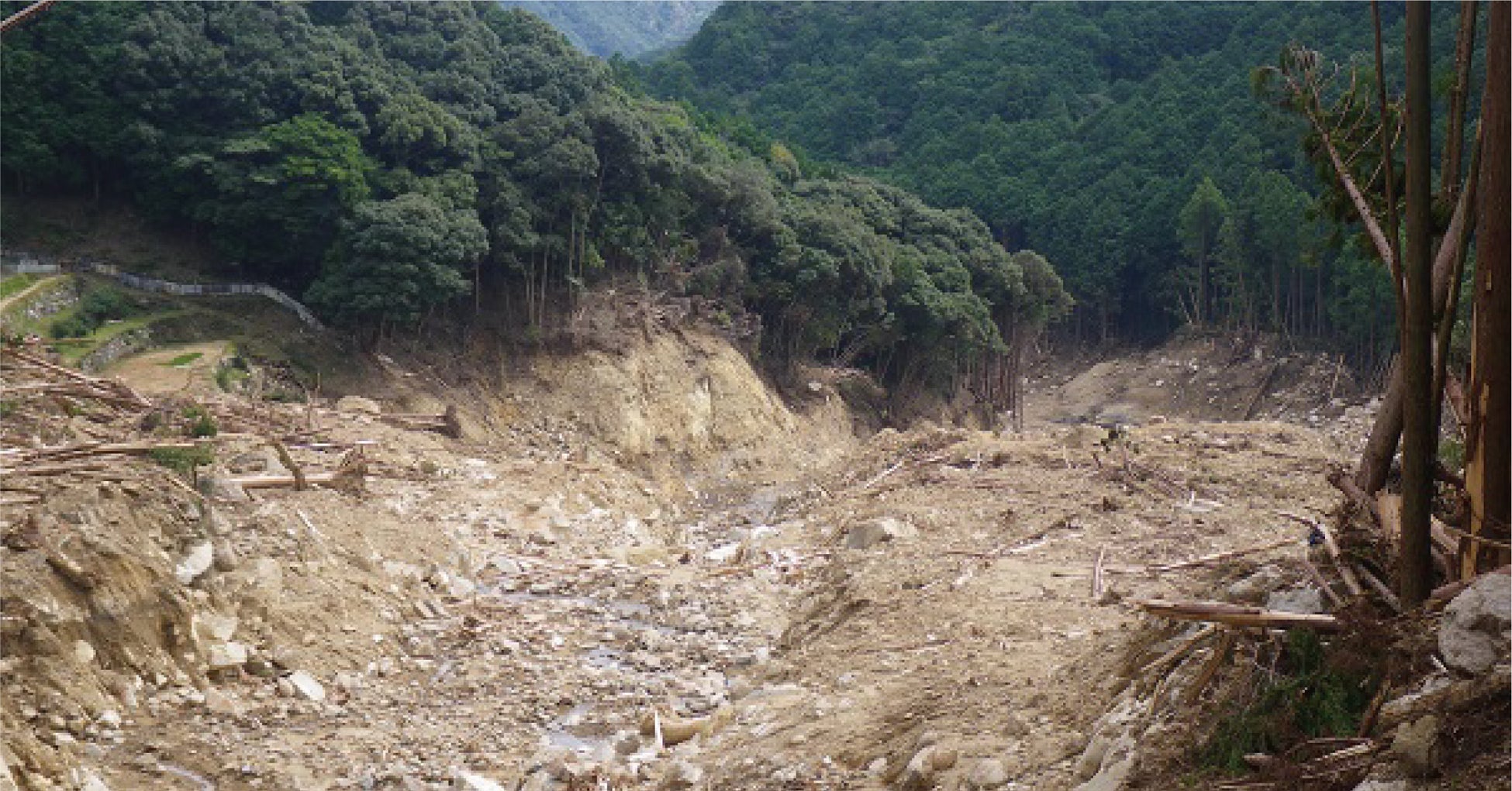 私たちソマノベースの原点にあるのは、2011年に起こった「紀伊半島大水害」。代表奥川はこの水害で被災し、土砂災害により大切な人や町を失いました。同じような悲劇が起こらないようにすべきことは何か、長年模索を続け、見つけたのが土砂災害と「山づくり」の関係でした。